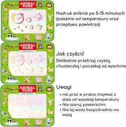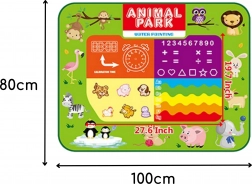 Vodní podložka Woopie Animal Park je ideální volbou pro děti od 3 let. Díky speciální vodní technologii se maluje bez inkoustu a barev – pouze s vodou, takže bez skvrn a špíny. Oboustranný potisk nabízí bohatý obsah pro učení abecedy, čísel, tvarů, zvířat i základů matematiky a hodin. Velký rozměr 100 × 80 cm je skvělý pro samostatné tvoření i společnou hru se sourozenci.