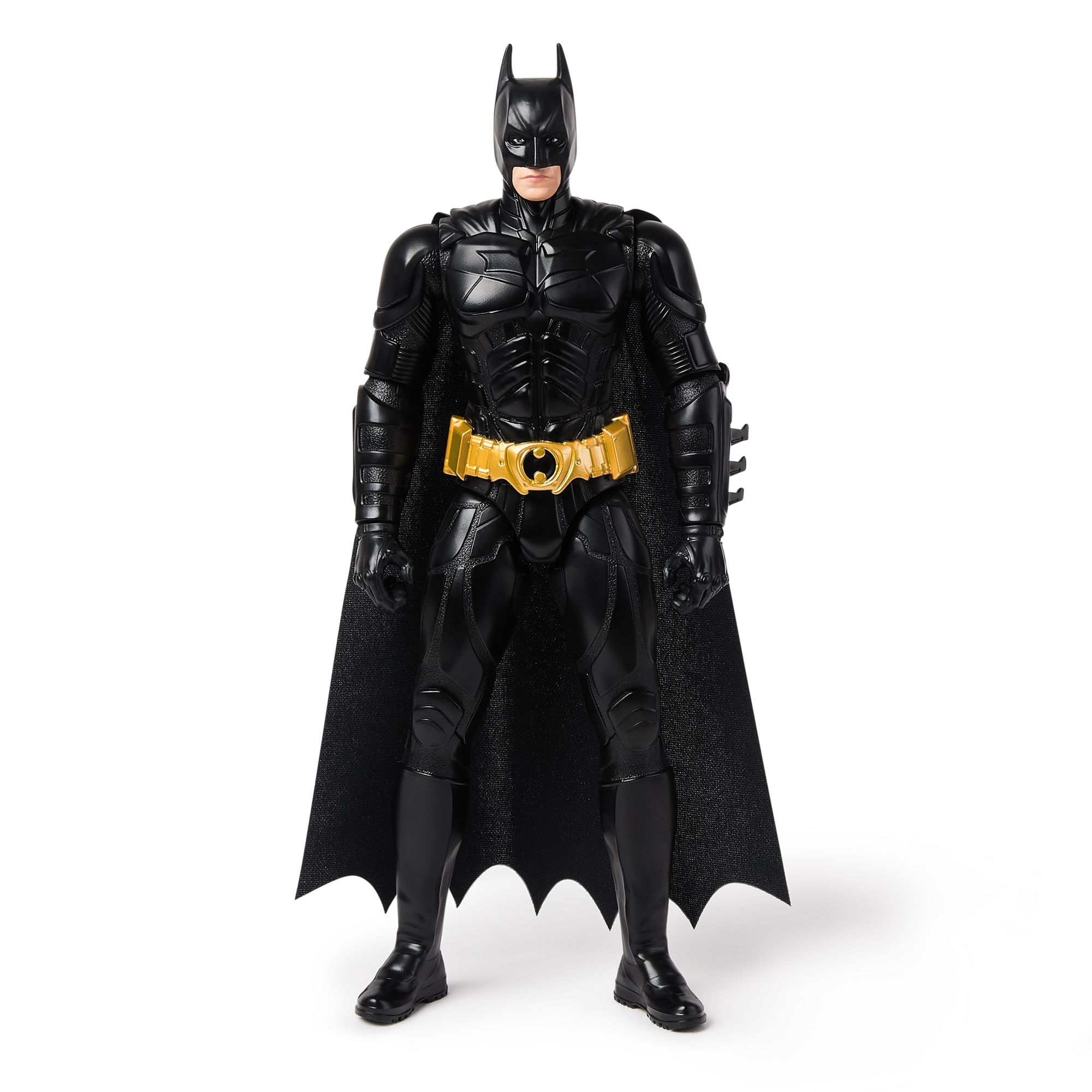 Černý kostým se zlatým opaskem, tvarovaná zbroj a dlouhý plášť věrně zachycují filmový design BATMAN z The Dark Knight.