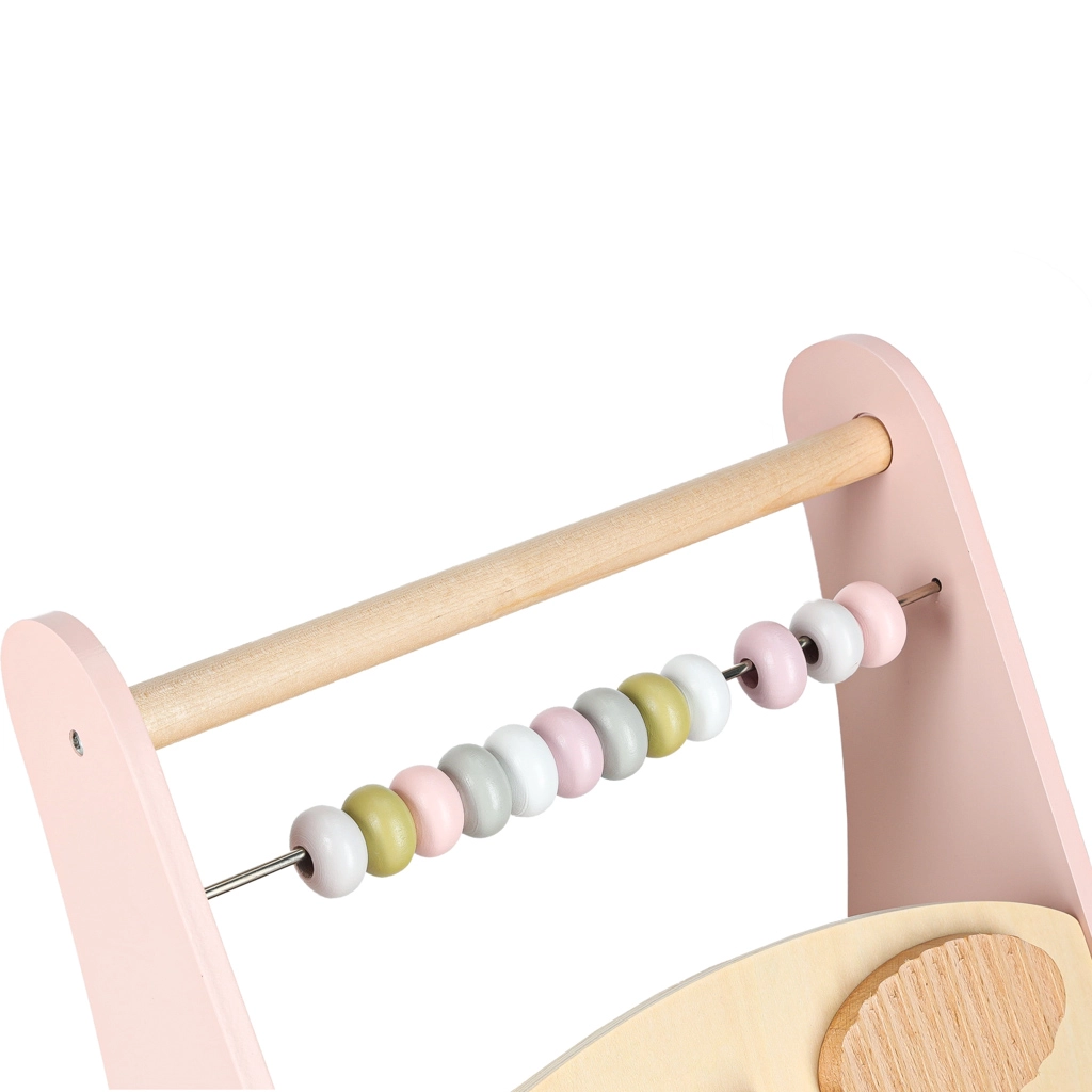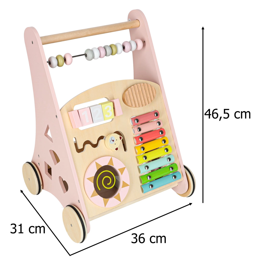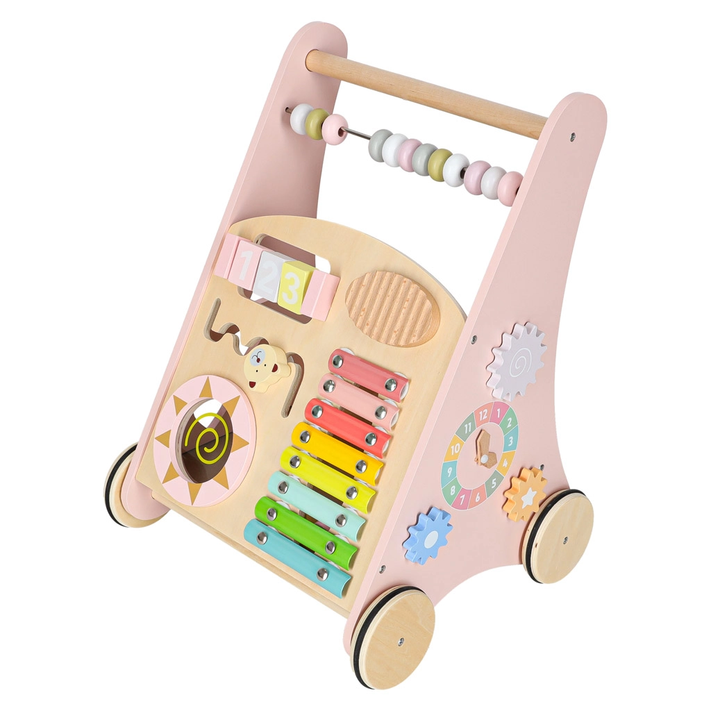 Toto stylové dřevěné chodítko v pastelově růžové barvě podporuje rovnováhu, koordinaci a jistotu při chůzi. Přední panel je osazen množstvím aktivit: počítadlem pro první počty, xylofonem pro objevování zvuků, ozubenými kolečky, otáčecím diskem, tříděním tvarů a posuvnými prvky, které rozvíjejí jemnou motoriku a soustředění.