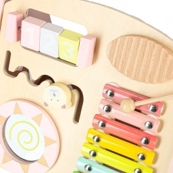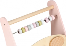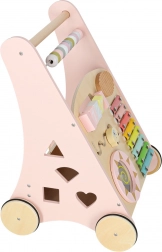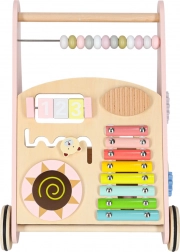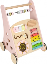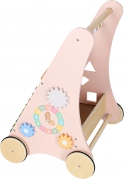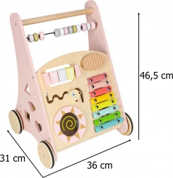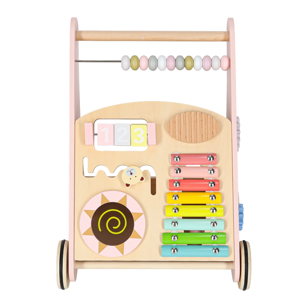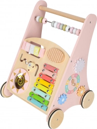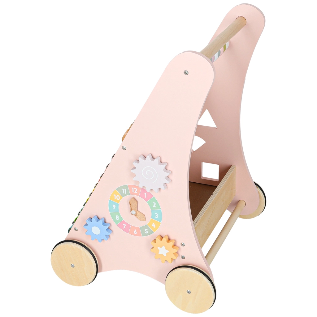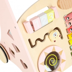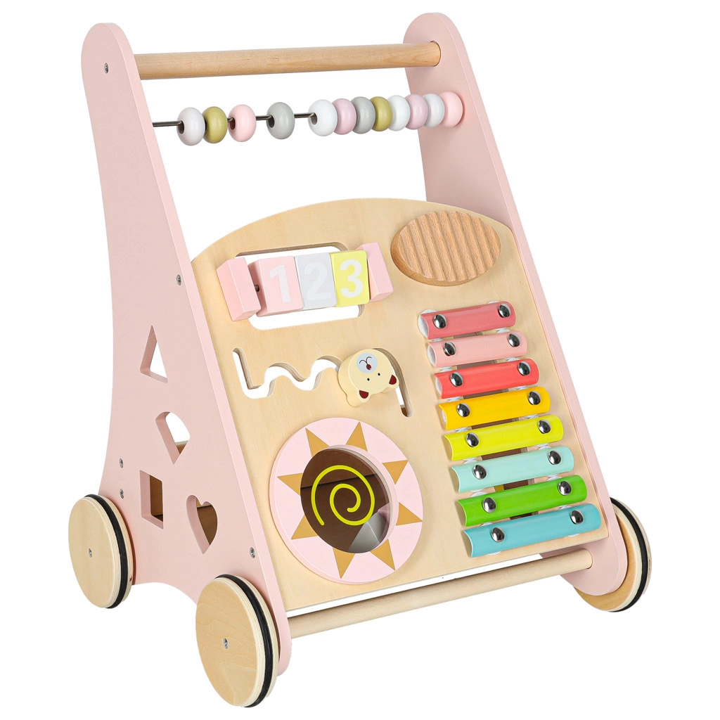 Toto stylové dřevěné chodítko v pastelově růžové barvě podporuje rovnováhu, koordinaci a jistotu při chůzi. Přední panel je osazen množstvím aktivit: počítadlem pro první počty, xylofonem pro objevování zvuků, ozubenými kolečky, otáčecím diskem, tříděním tvarů a posuvnými prvky, které rozvíjejí jemnou motoriku a soustředění.