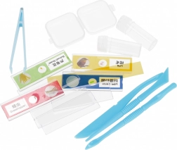 Mikroskop, 1× pinzeta, 3× nože/preparátové podložky, 2× skúmavky, 1× krabička, 4× výskumné šablony s výkresy, 4× šablony, návod