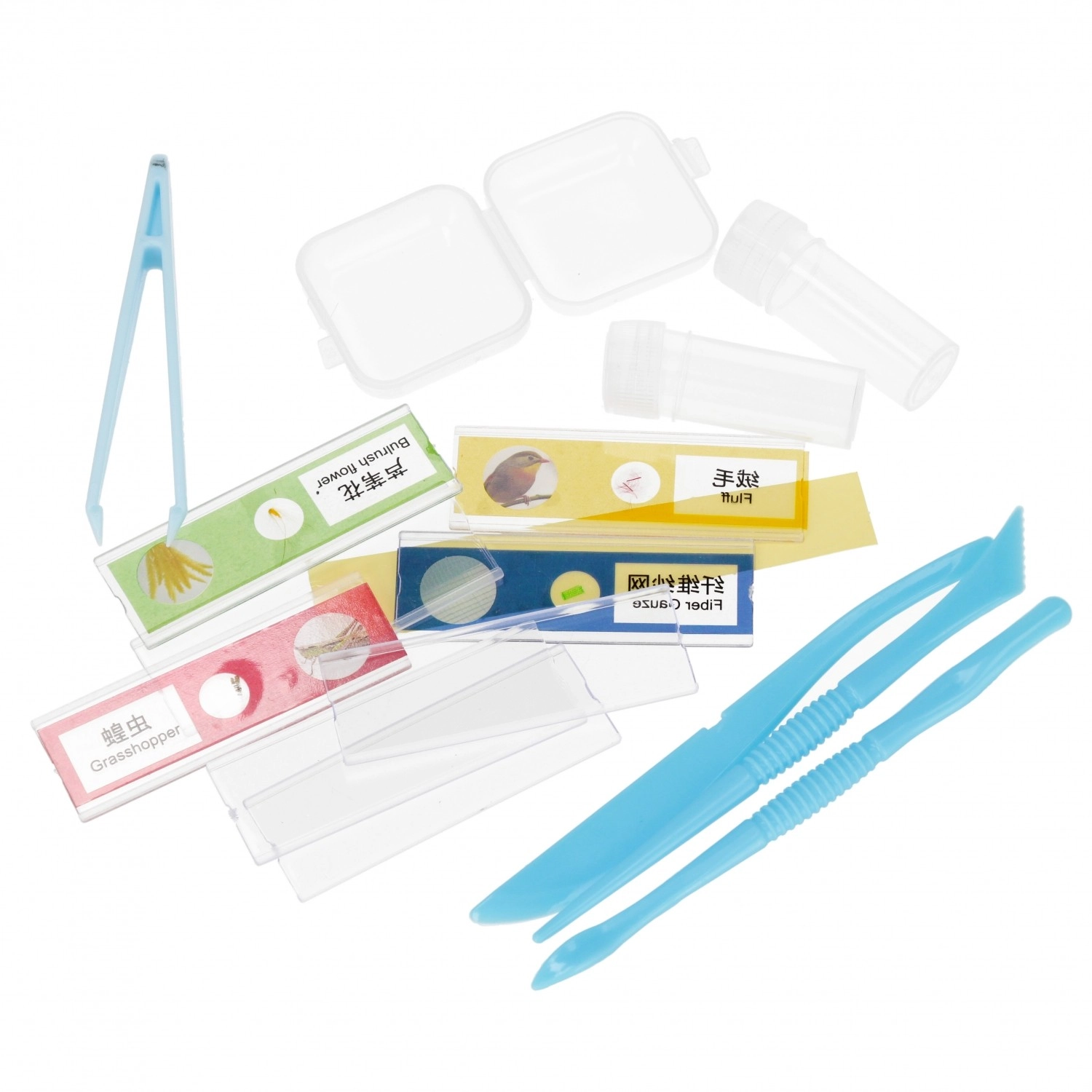 • Kompletní sada: mikroskop, 1× pinzeta, 3× nože/preparátové podložky, 2× skúmavky, 1× krabička, 4× výskumné šablony s výkresy, 4× prázdné šablony, návod