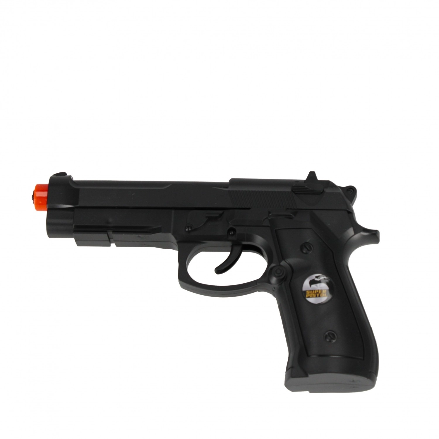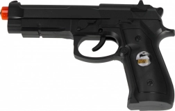Realisticky tvarovaná dětská pistole s oranžovým koncem pro bezpečnou hru. Texturovaná rukojeť a lehká konstrukce pro pohodlné držení.