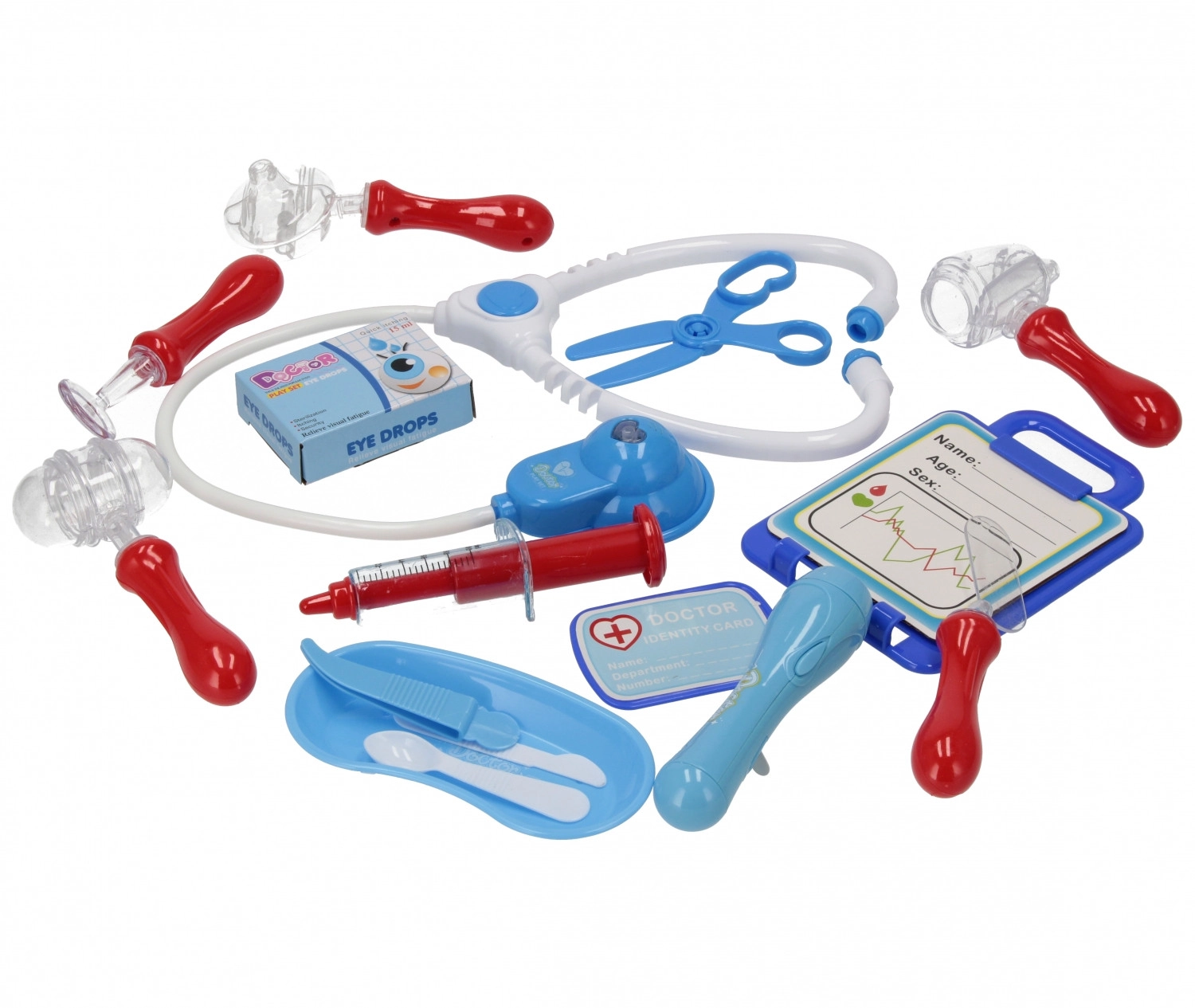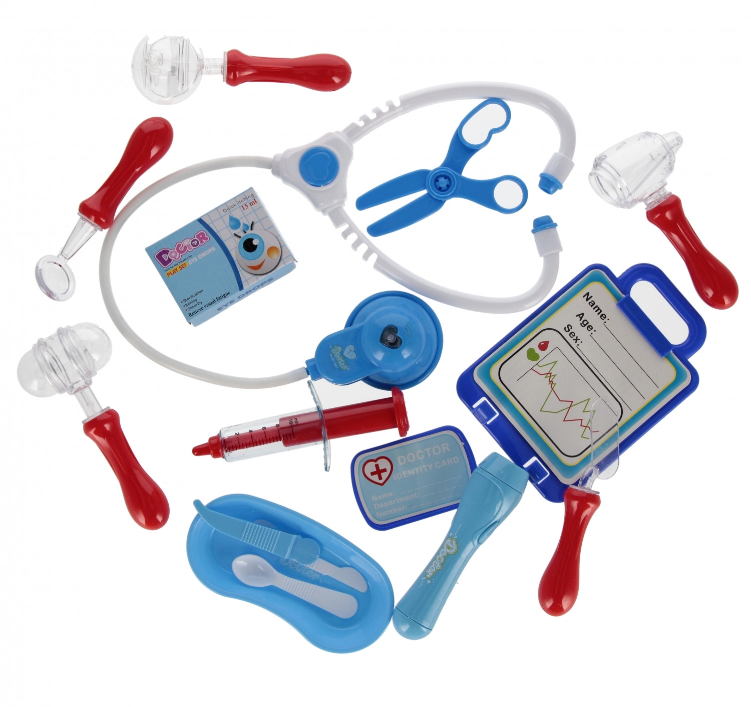 Souprava obsahuje vše potřebné k základnímu vyšetření: stetoskop, injekční stříkačku, kartonové „léky“, baterku, laryngologické pomůcky, nádobku na nástroje, kartu pacienta a nůžky. Díky rozměrům 40 × 29 cm je set dobře přenosný a současně bohatý na obsah.