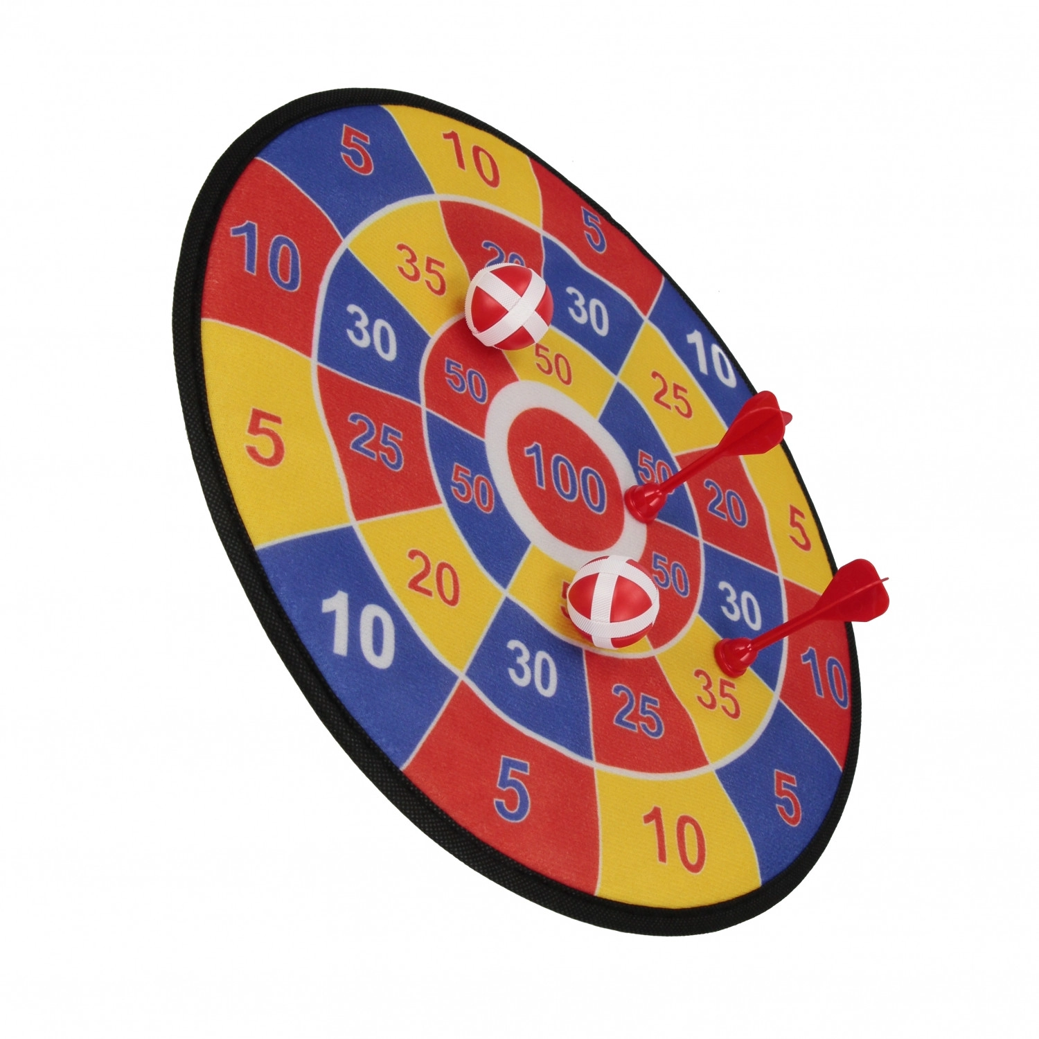 Kontrastní červené, žluté a modré sektory s čísly motivují děti k trefám a učí je počítat body zábavnou formou.