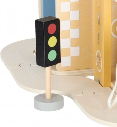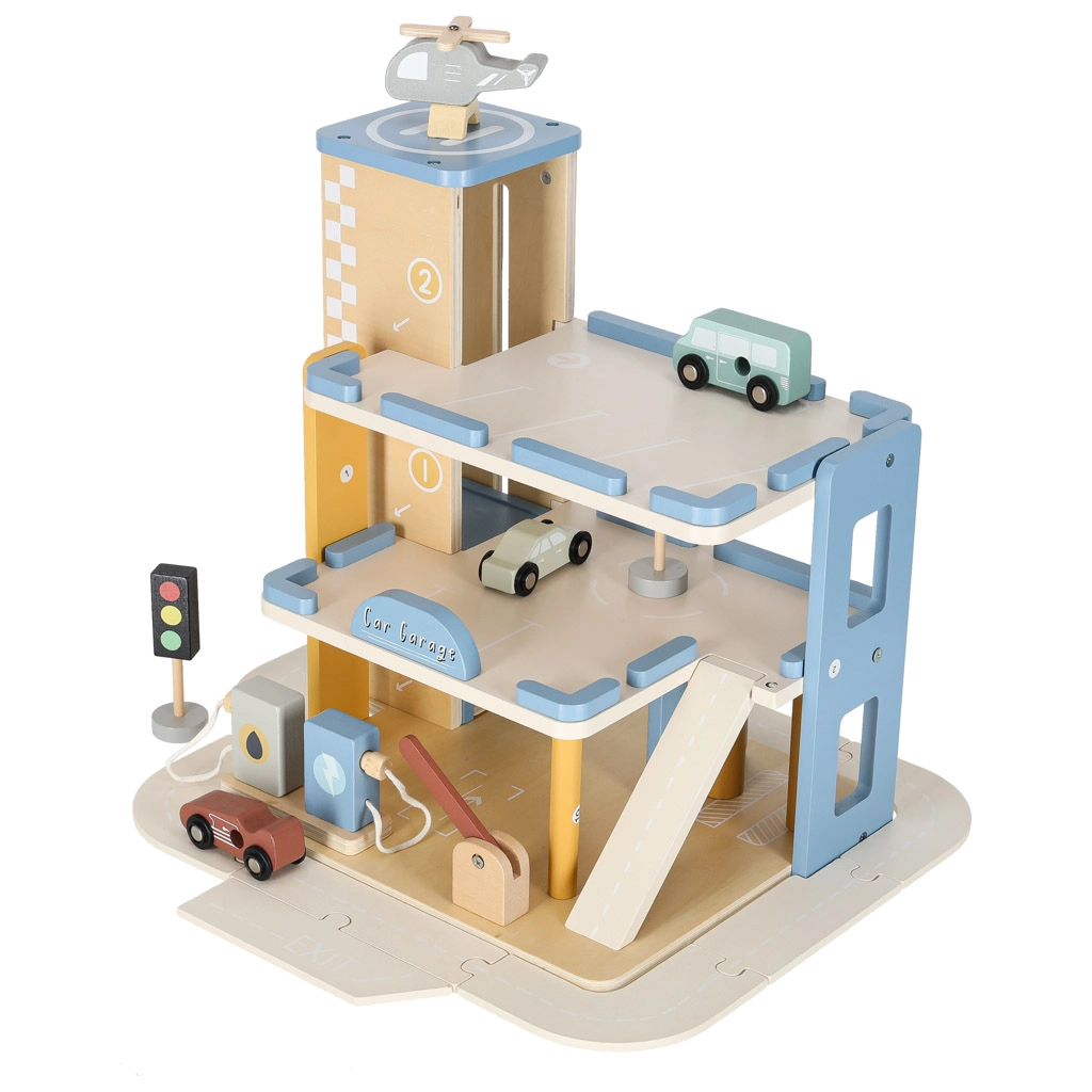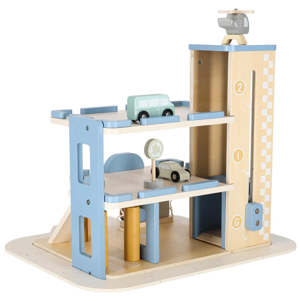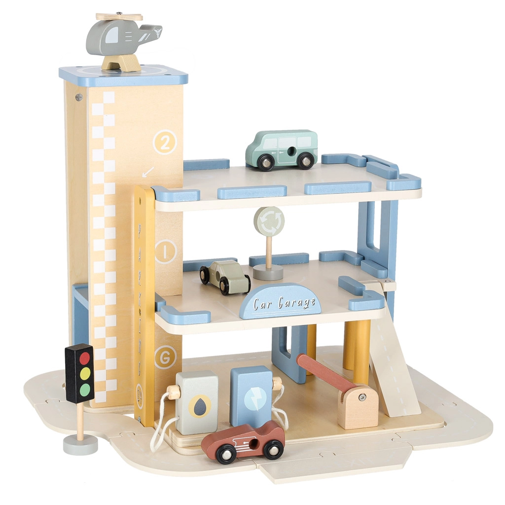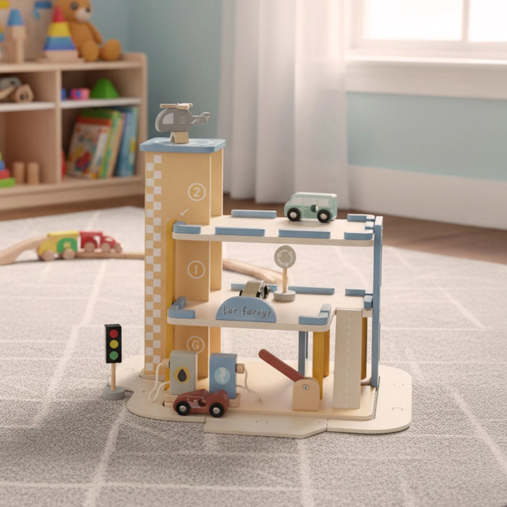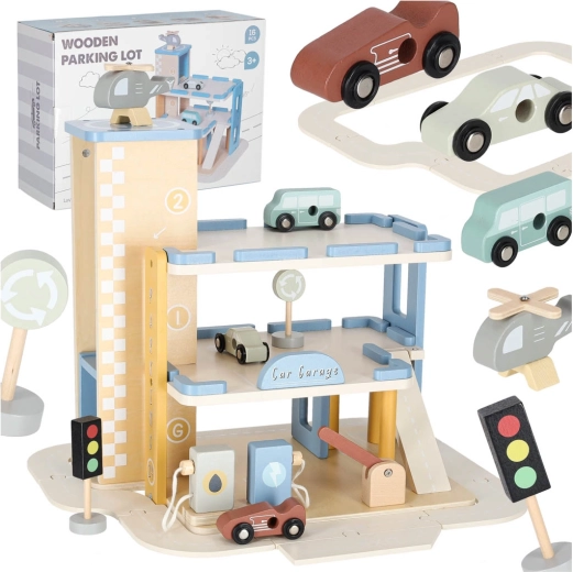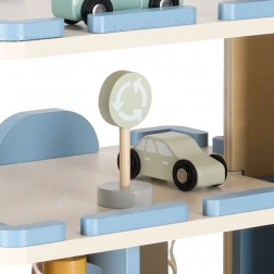 Tento víceúrovňový dřevěný parkovací dům spojuje garáže, servis a benzínovou stanici v jednom. Děti mohou auta zvedat pohyblivým výtahem, projíždět po nájezdech, parkovat na jednotlivých patrech a doplňovat „palivo“. Jemné pastelové barvy a hladké dřevěné zpracování jsou příjemné na dotek a vizuálně zapůsobí v každém dětském pokoji.