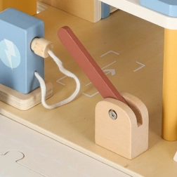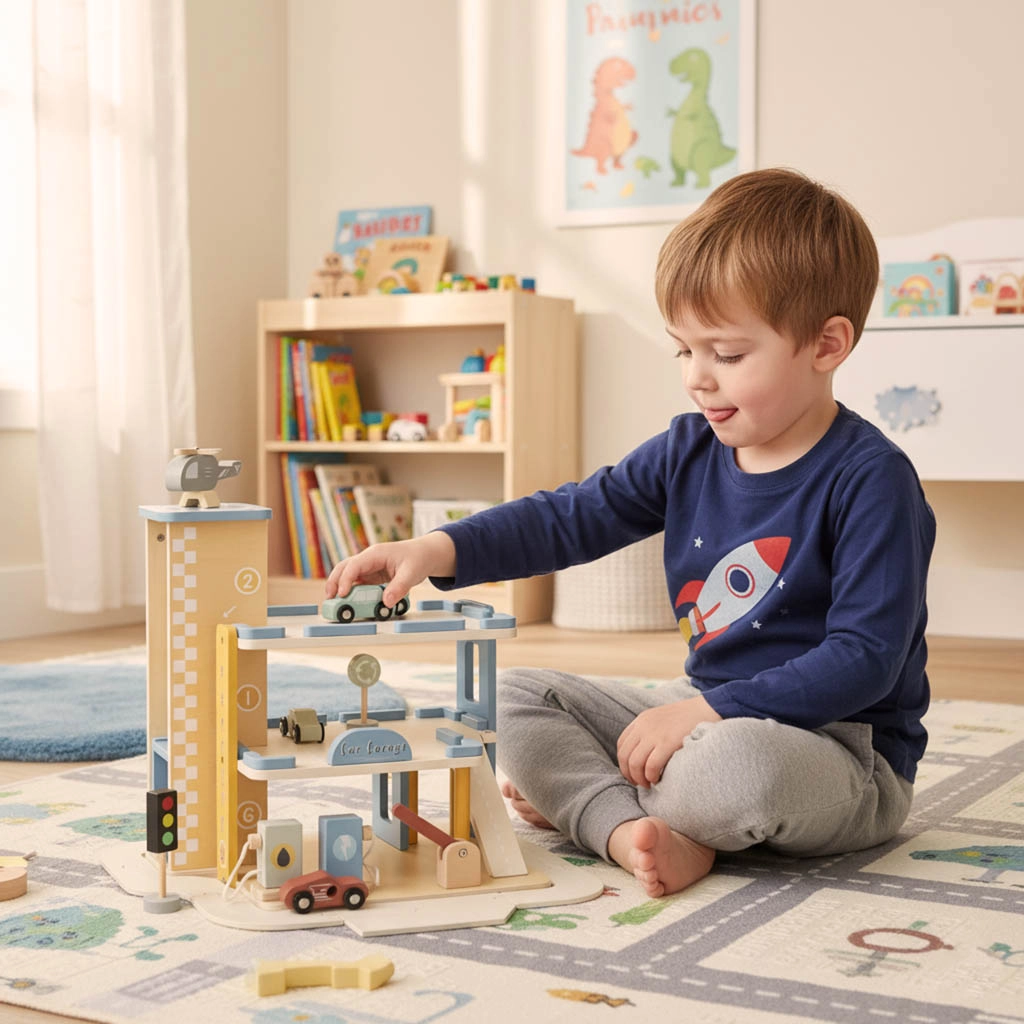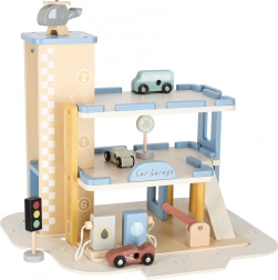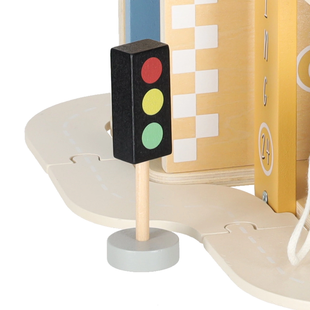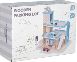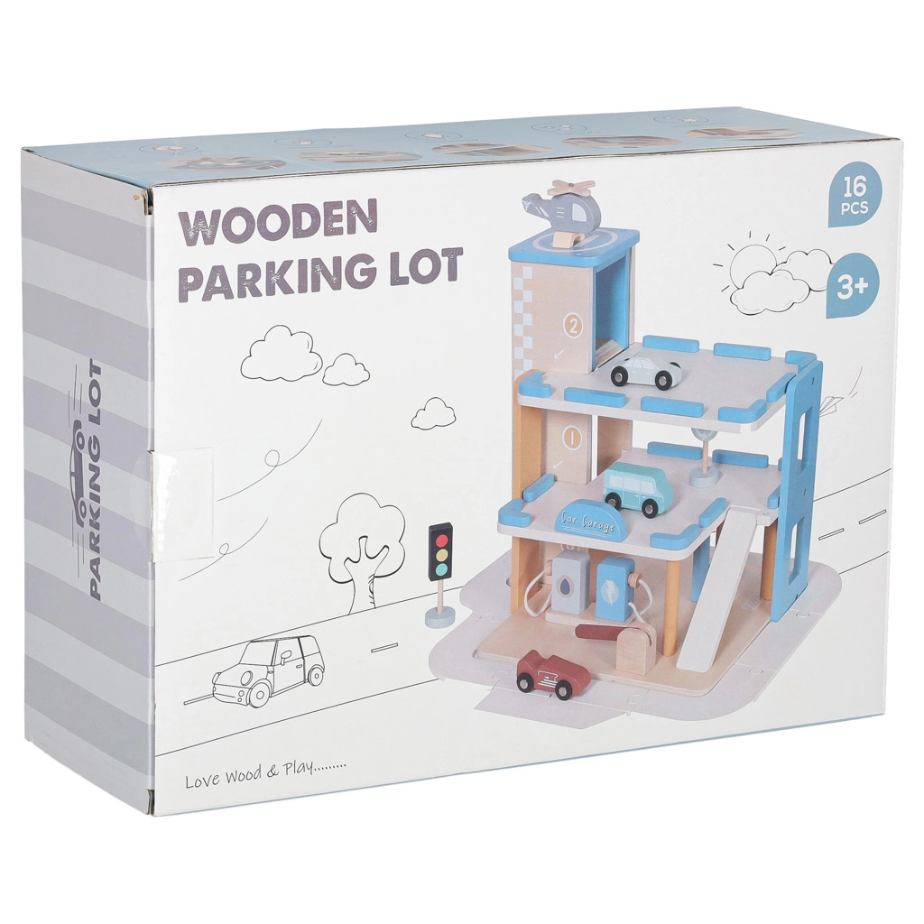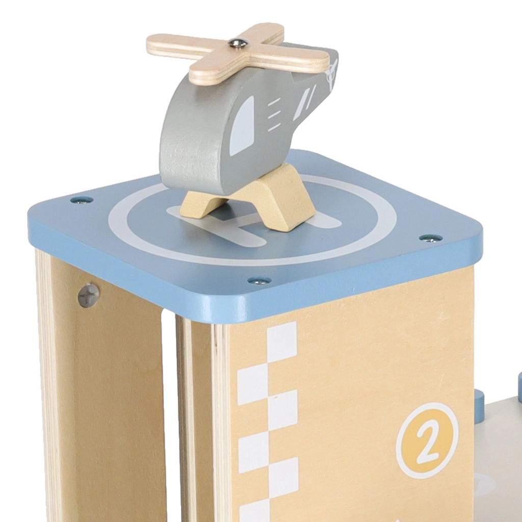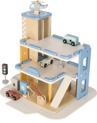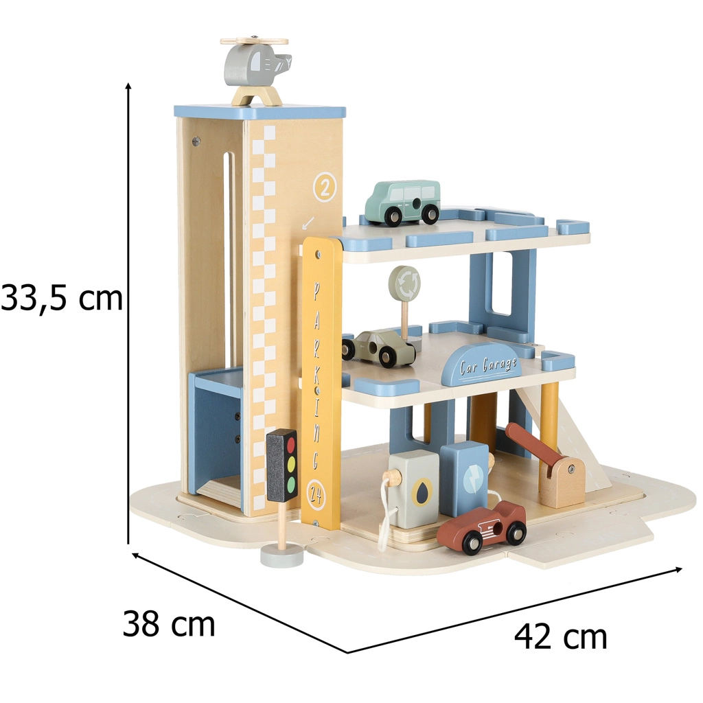 Tento víceúrovňový dřevěný parkovací dům spojuje garáže, servis a benzínovou stanici v jednom. Děti mohou auta zvedat pohyblivým výtahem, projíždět po nájezdech, parkovat na jednotlivých patrech a doplňovat „palivo“. Jemné pastelové barvy a hladké dřevěné zpracování jsou příjemné na dotek a vizuálně zapůsobí v každém dětském pokoji.
