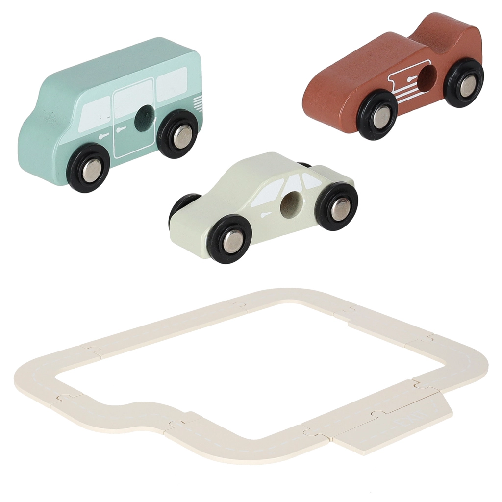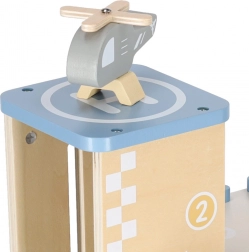 V balení najdete 3 dřevěná autíčka a vrtulník, aby mohly probíhat záchranné akce, závody i klidné parkování.