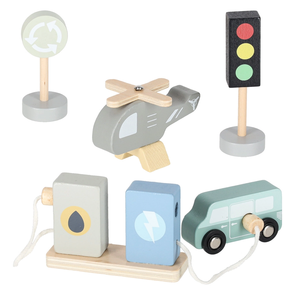 Součástí je vše, co je potřeba pro realistickou hru: 3 autíčka, vrtulník, dopravní značky, závora, čerpadlo a silniční díly. Set tak přirozeně rozvíjí koordinaci oko–ruka, logiku i sociální dovednosti při hře s kamarády.
