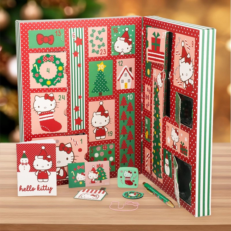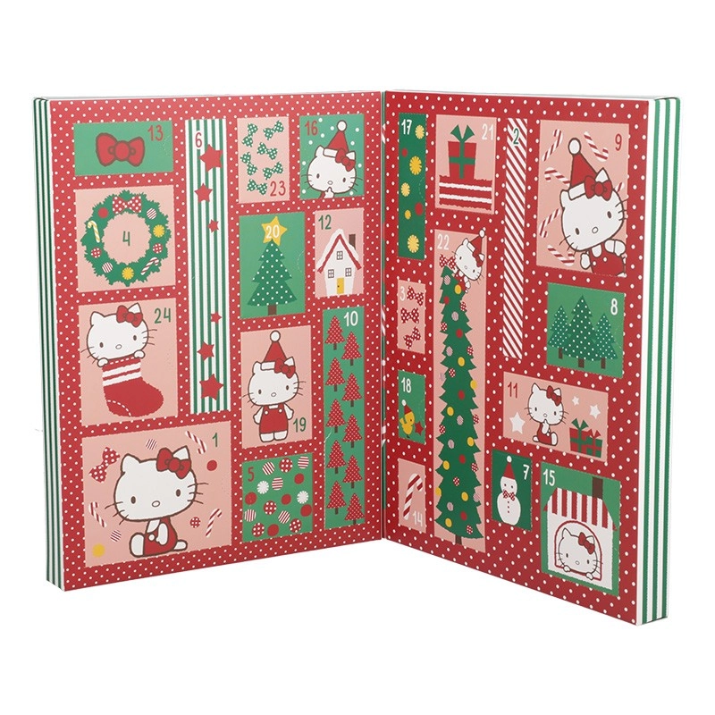 Každé okénko ukrývá jiný dárek, který zaujme svou užitečností i vzhledem. Najdete zde například bloček, tužky, pero, gumu, klipy na papíry, samolepky, ořezávátko, lepicí pásku, magnetku a další maličkosti. Skvělé jako dárek pro děti i milovníky značky HELLO KITTY.