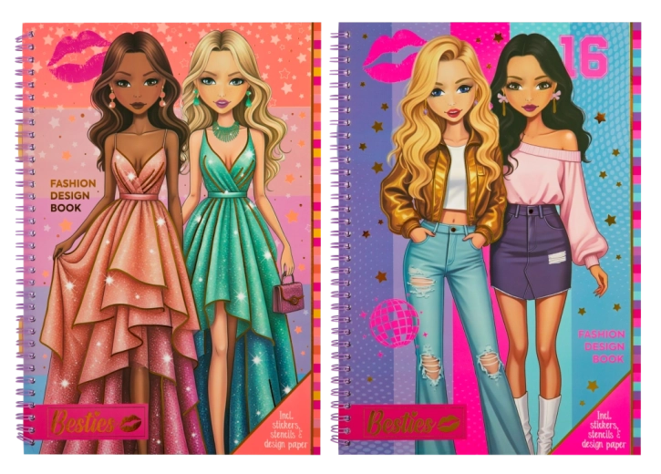 Objevte svět stylu s kreativním sešitem Besties – ideální volbou pro malé designérky. Děti mohou navrhovat vlastní módní kolekce, kombinovat oblečení a doplňky a vytvářet originální skici s pomocí předtištěných modelů, šablon a samolepek.
