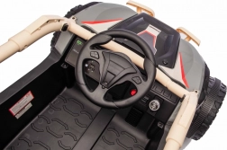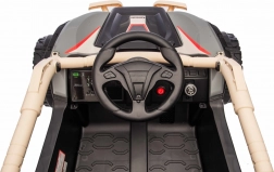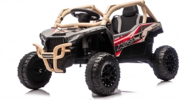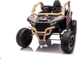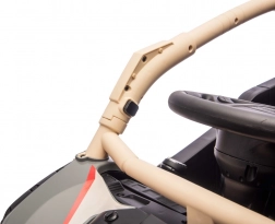 Tato off-road buggy v khaki provedení přináší autentický vzhled side-by-side stroje s vysokým podvozkem, ochraným rámem a masivními koly. Dva přední motory 20 W a dva zadní 45 W zajišťují sílu do kopců i na nerovných površích, zatímco 24V5Ah akumulátor dodá dostatek energie na delší vyjížďky. Pěnová kola EVA tlumí vibrace a zadní odpružení zvyšuje komfort a stabilitu.