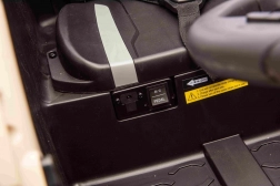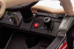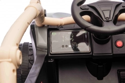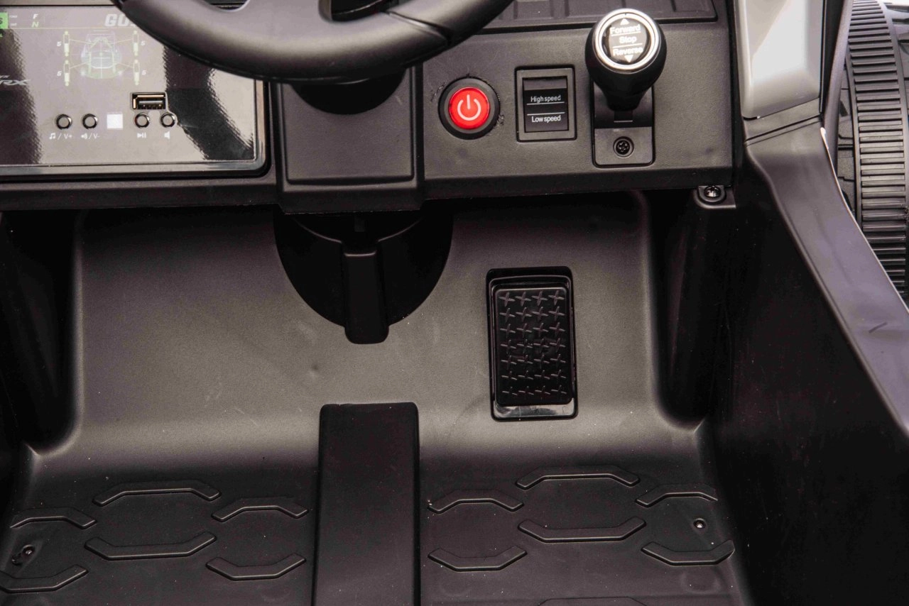 Bezpečnost a ovladatelnost jsou na prvním místě: plynulý rozjezd, volič směru vpřed/vzad, 2 rychlostní stupně a přední LED světla. Dětské sedadlo z černé eko kůže je vybaveno bezpečnostními pásy. Multimediální panel s USB, MP3, Bluetooth a vestavěnými melodiemi doplní každou jízdu oblíbenou hudbou. Startování probíhá pohodlným tlačítkem.