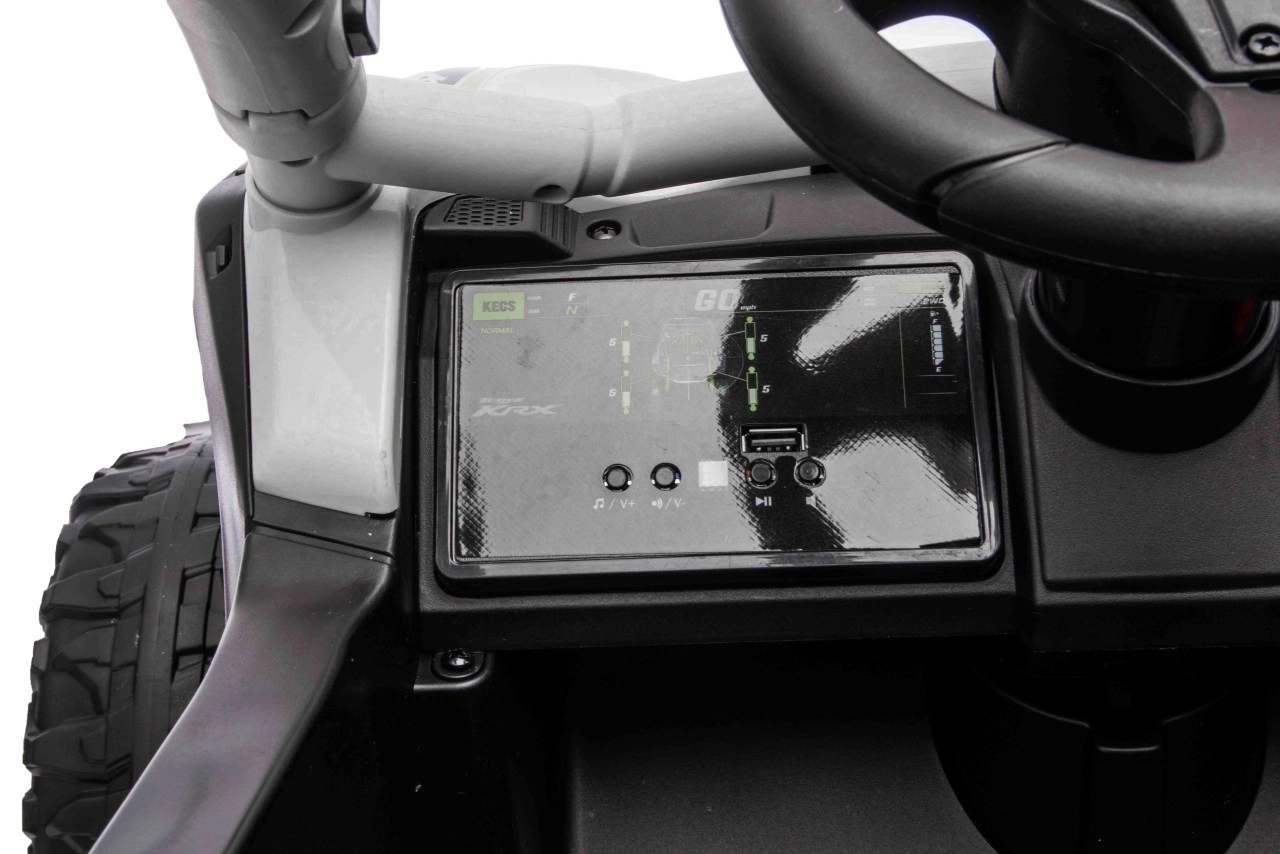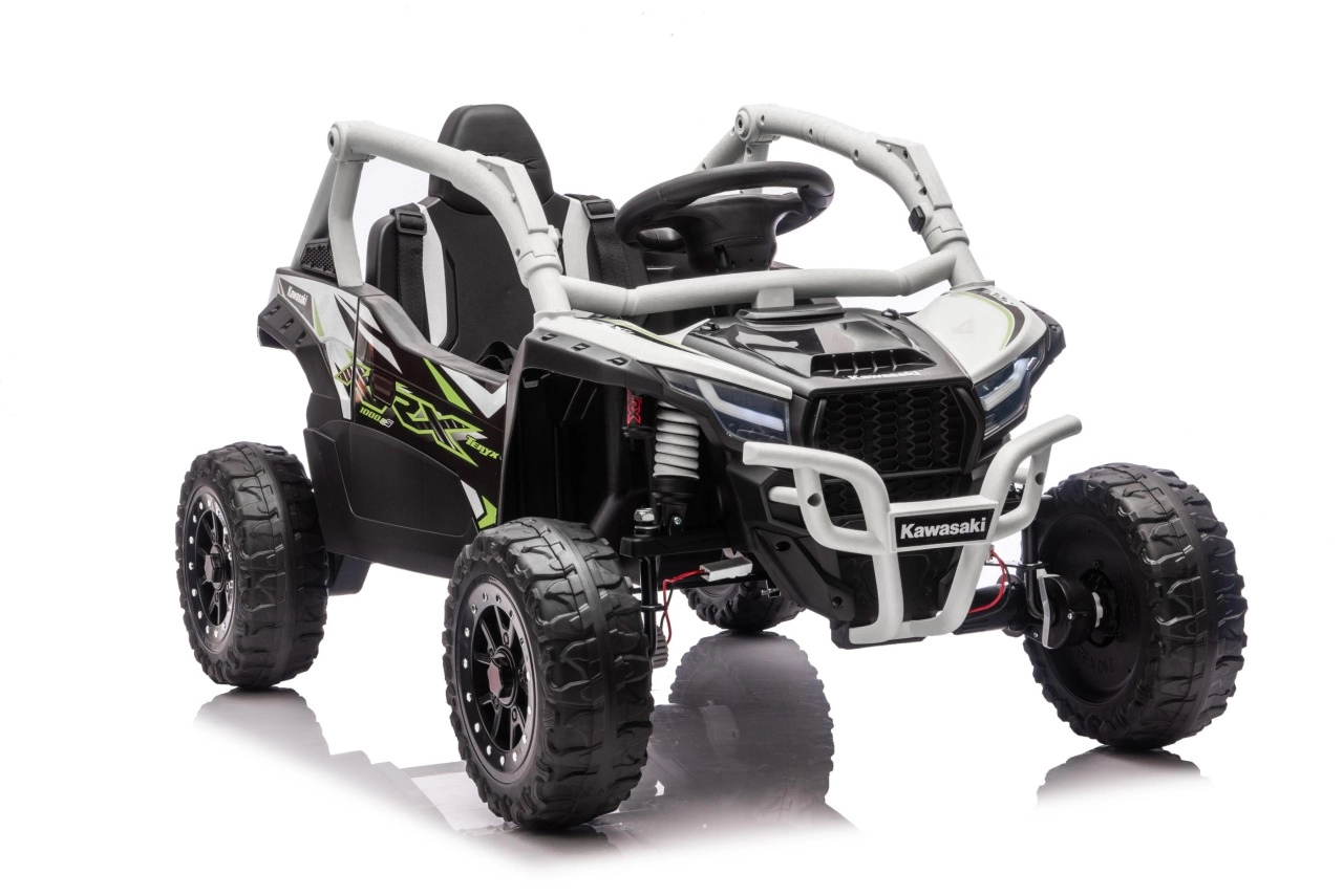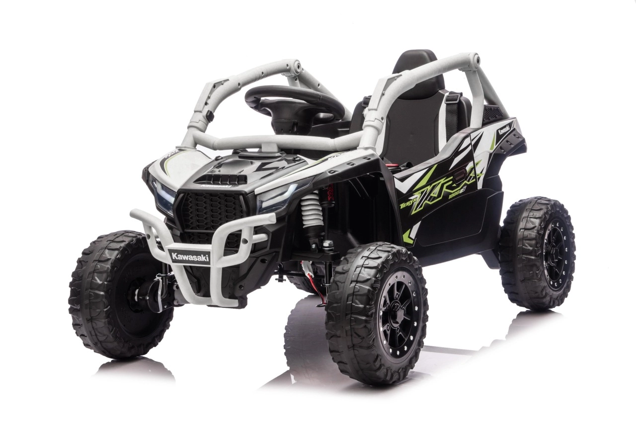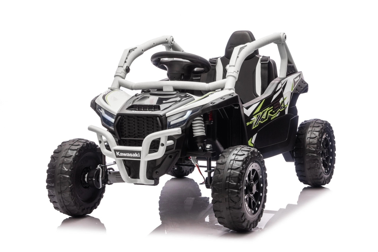 Šedé dětské vozítko KAWASAKI TERYX KRX1000 kombinuje atraktivní off-road design s bezpečnou a pohodlnou jízdou. Pohon zajišťuje 24V5Ah baterie a čtveřice motorů pro jistý záběr v terénu, zatímco měkká kola EVA s výrazným dezénem poskytují skvělou trakci a tichý chod. Zadní pružinové tlumiče pak zvyšují komfort na nerovnostech.