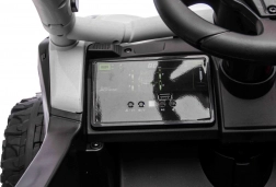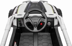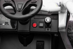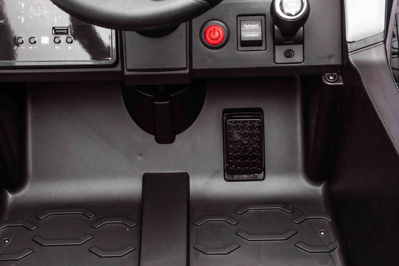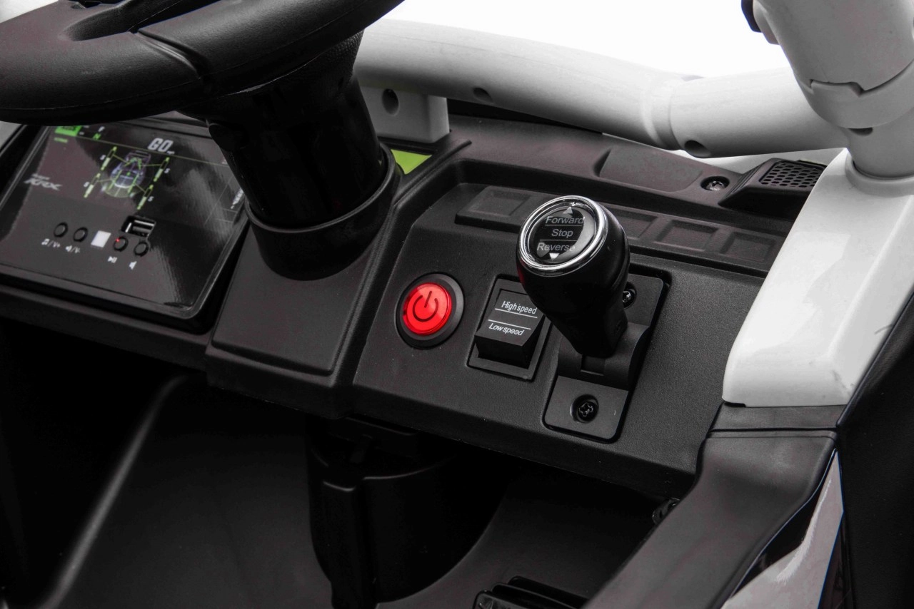 Malí jezdci ocení plynulý rozjezd, volbu 2 rychlostí a jízdu vpřed/vzad. Rodiče mají situaci pod kontrolou díky dálkovému ovladači 2,4 GHz se 3 rychlostmi a bezpečnostním tlačítkem Stop. Interiér doplňuje černé sedadlo z eko kůže s bezpečnostními pásy a bohatý audio panel s MP3, Bluetooth, USB, přednastavenými melodiemi a klaksonem na volantu.