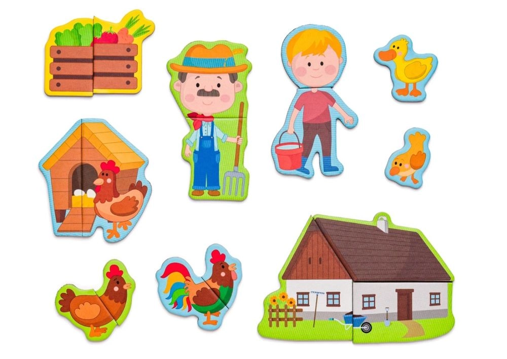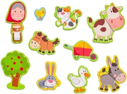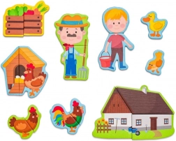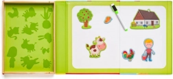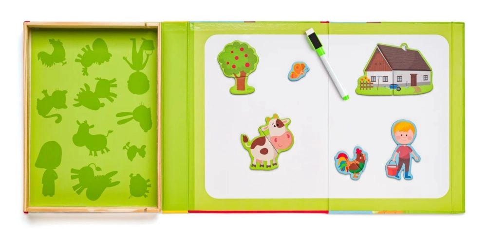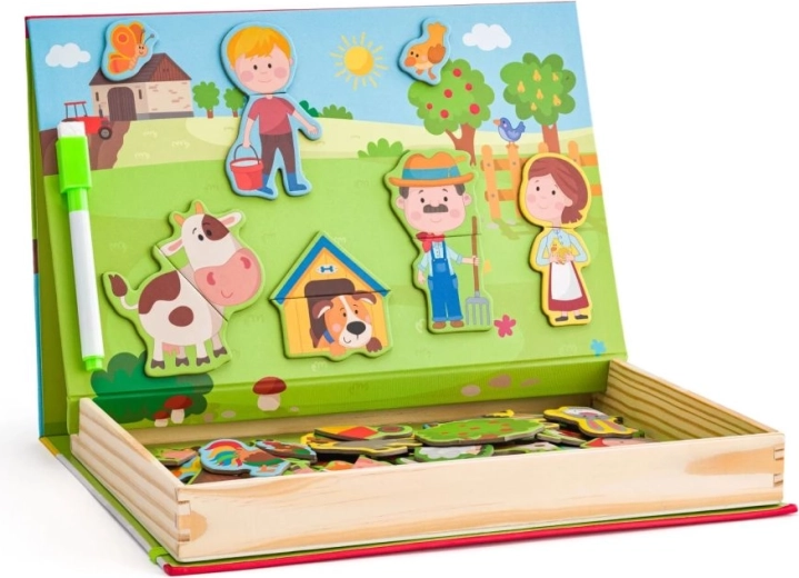 Tato magnetická sada s motivem farmy přináší dětem hodiny tvořivé zábavy. Otevírací dřevěný box slouží jako magnetická tabule, na kterou lze přichytit barevné dílky s postavami, zvířátky a doplňky. Děti si skládají vlastní příběhy, učí se poznávat zvířata a procvičují koordinaci oko–ruka.