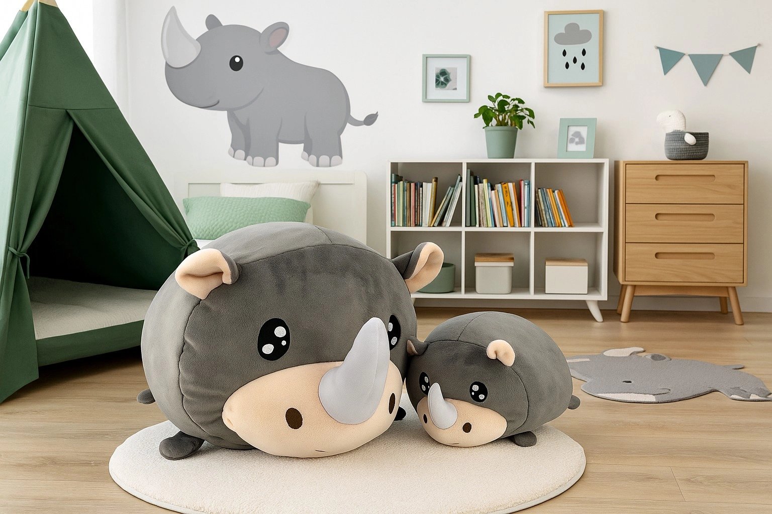 Menší nosorožec (20 cm) je ideální do kočárku či postýlky jako mazlíček, větší (40 cm) se hodí jako polštářek do auta, na cesty nebo jako útulná dekorace do dětského pokojíčku. Údržba je snadná – stačí vyprat na 30 °C.