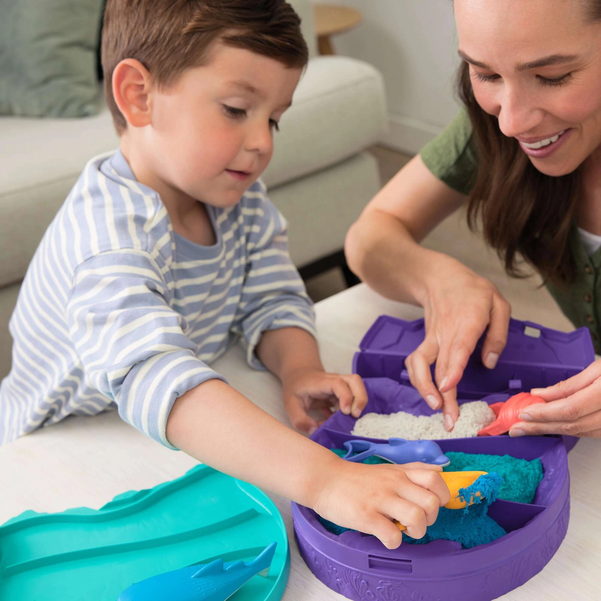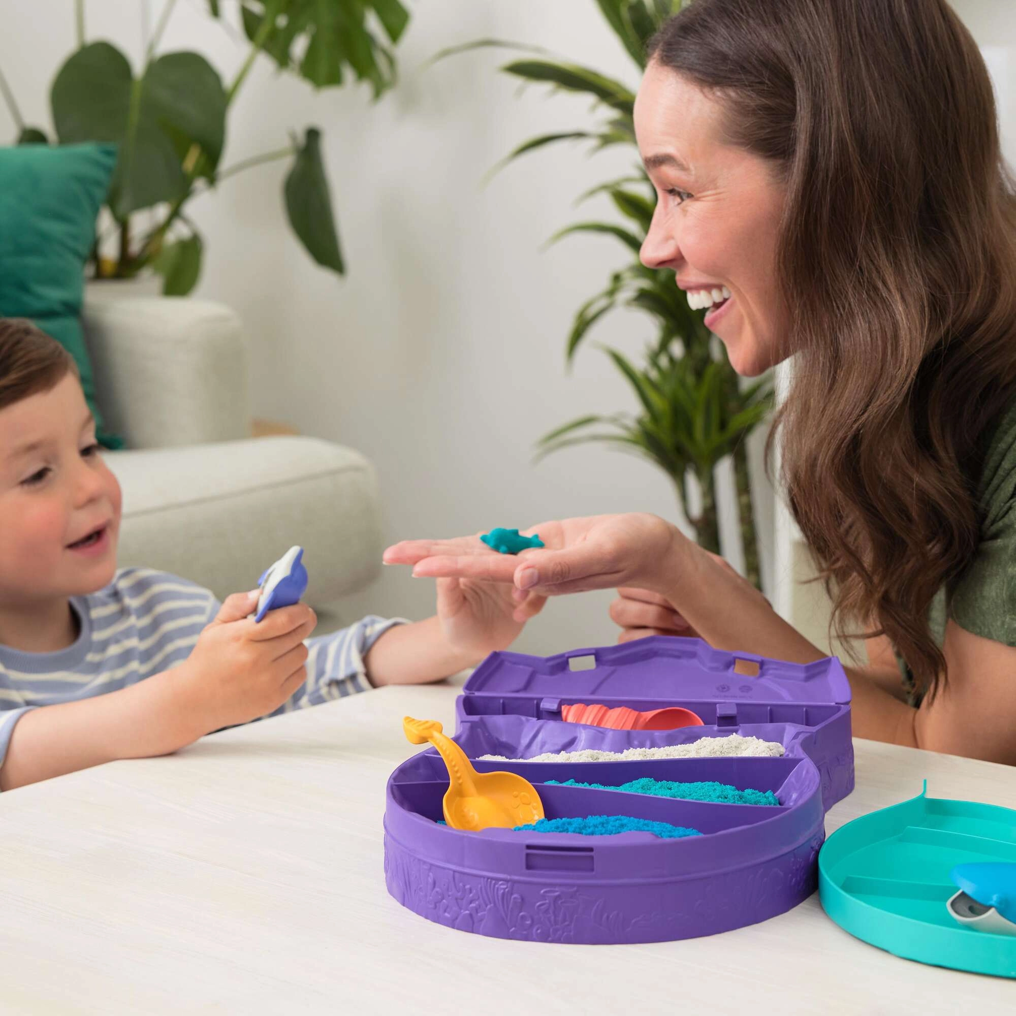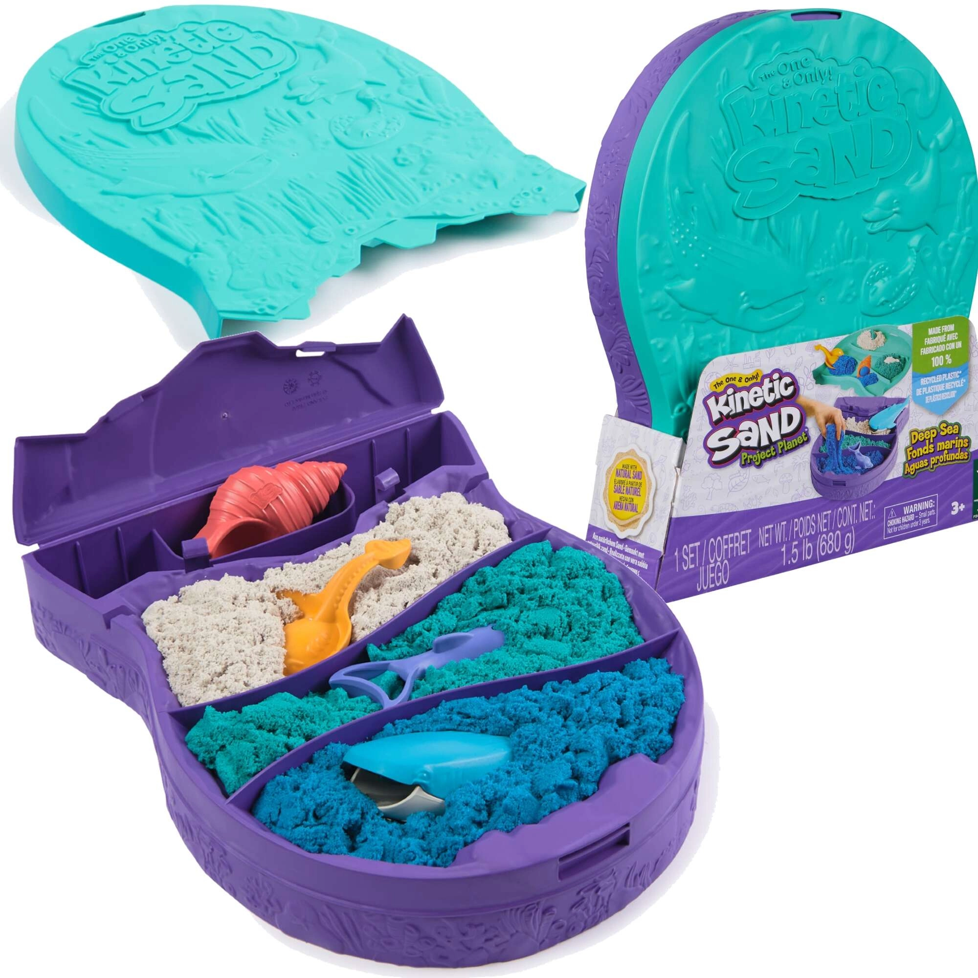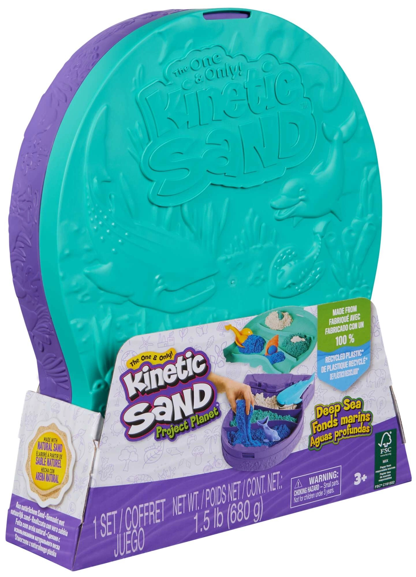 Kinetický písek Kinetic Sand napodobuje pocit mokrého písku, ale bez špíny a vysychání. Děti mohou snadno modelovat, krájet, mačkat a stavět, zatímco si procvičují koordinaci a tvořivost. Set Deep Sea nabízí kombinaci modré, bílé a zelené pro tvorbu zábavných podmořských scén a tvarů.