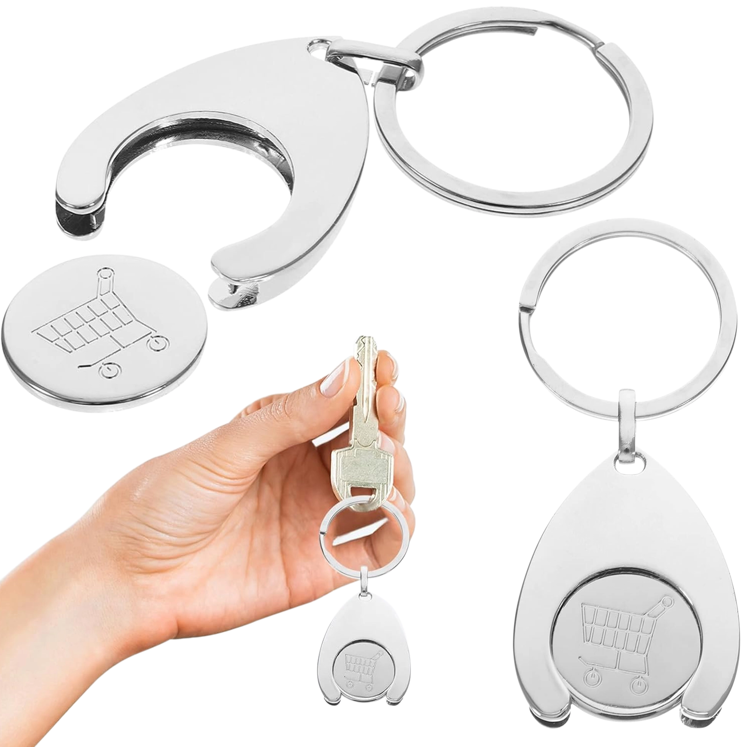 Chytré řešení 2v1: elegantní kovová klíčenka s vyjímatelným žetonem pro uvolnění nákupního vozíku. Díky pevnému kroužku ji snadno připnete ke klíčům, tašce nebo batohu a máte rychlý přístup k vozíku bez mince.