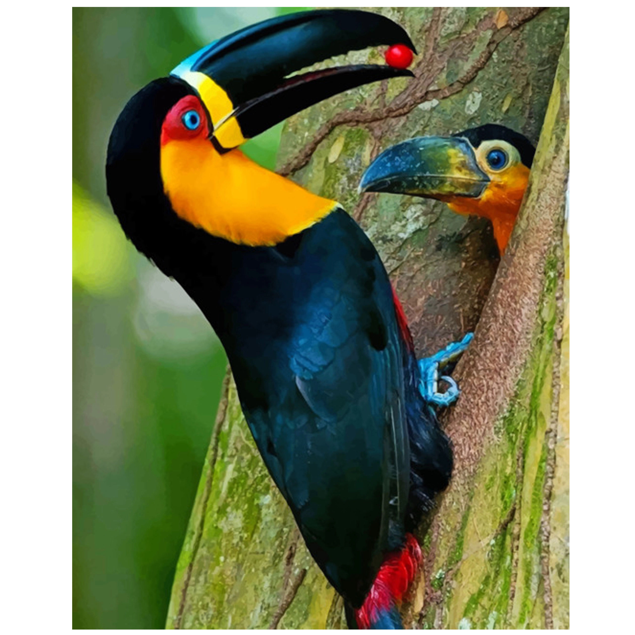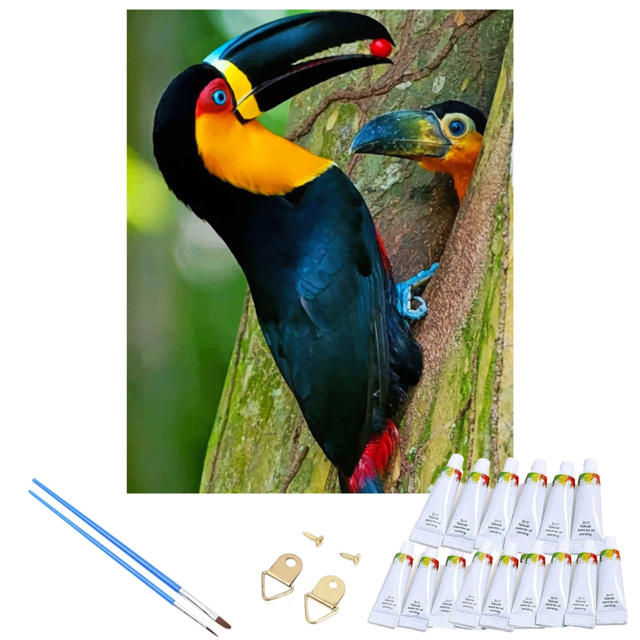 Tento kompletní DIY set vám umožní vytvořit působivý obraz s motivem exotického tukana bez předchozích zkušeností. Každé očíslované pole na plátně odpovídá konkrétnímu odstínu, což zaručuje snadné, zábavné a relaxační malování. Díky napnutí na dřevěný blejtram můžete začít ihned po rozbalení a hotové dílo rovnou pověsit.