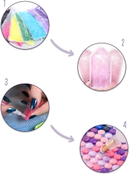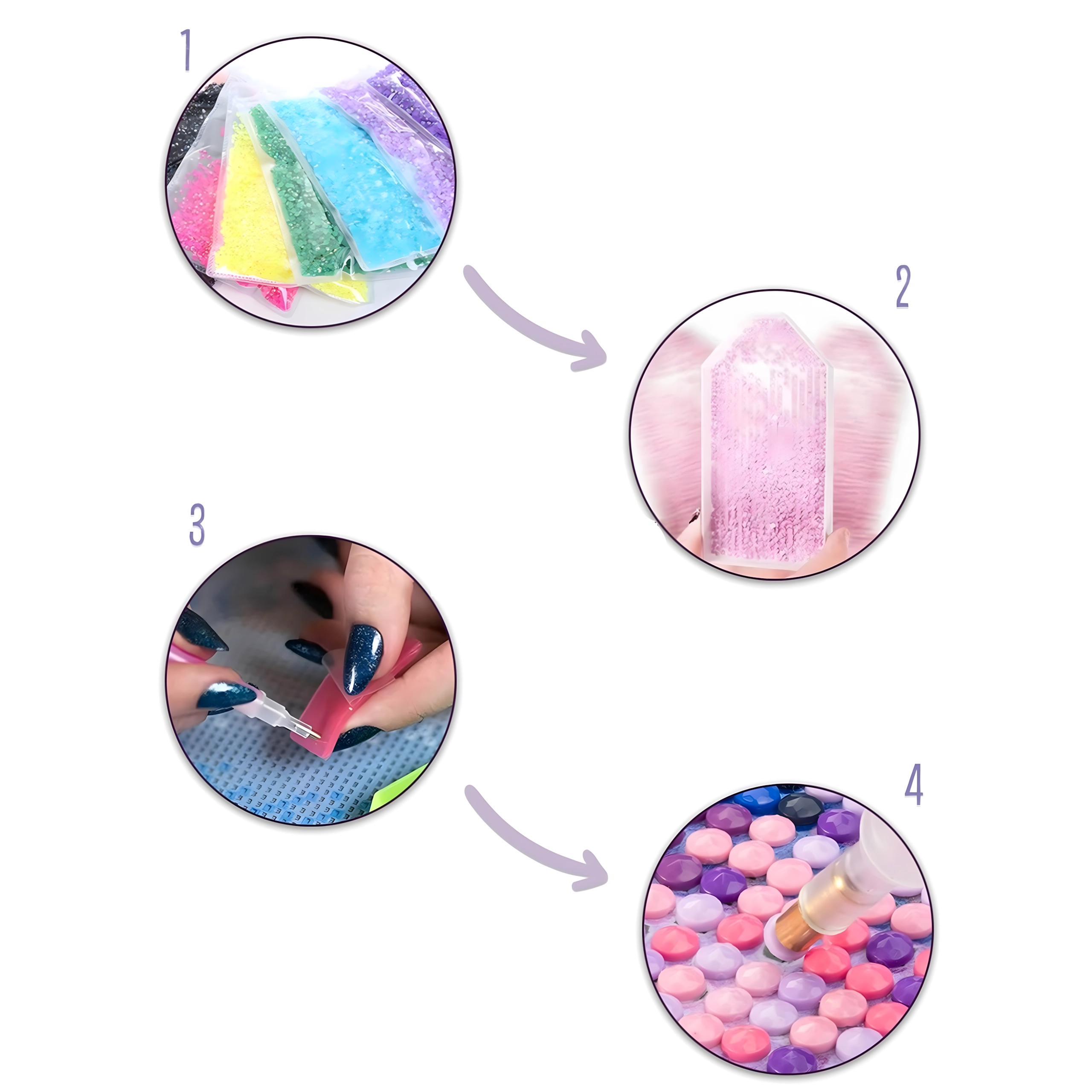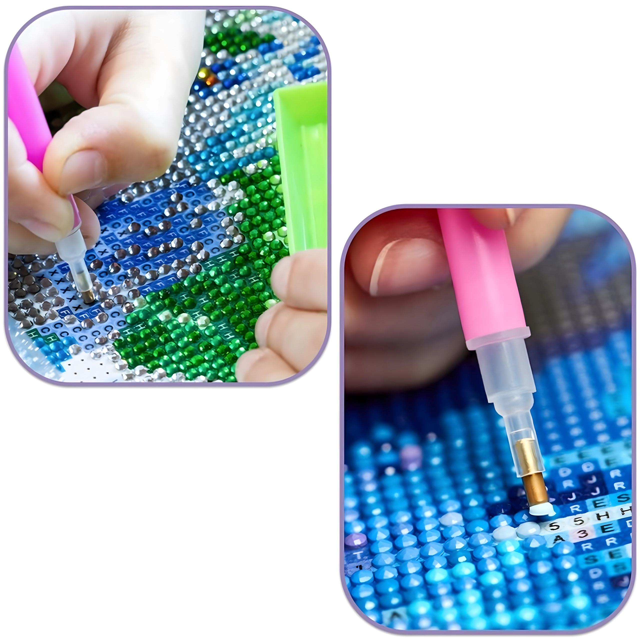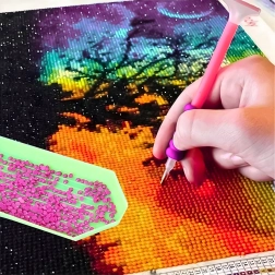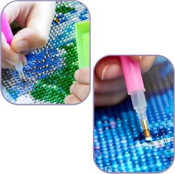 Vše potřebné máte hned po ruce: samolepicí plátno s potiskem, třpytivé kamínky (drilly), aplikační pero, vosk i třídicí tácek. Přesné nástroje a více-umísťovací nástavce urychlí práci a zaručí čistý, rovnoměrný výsledek.