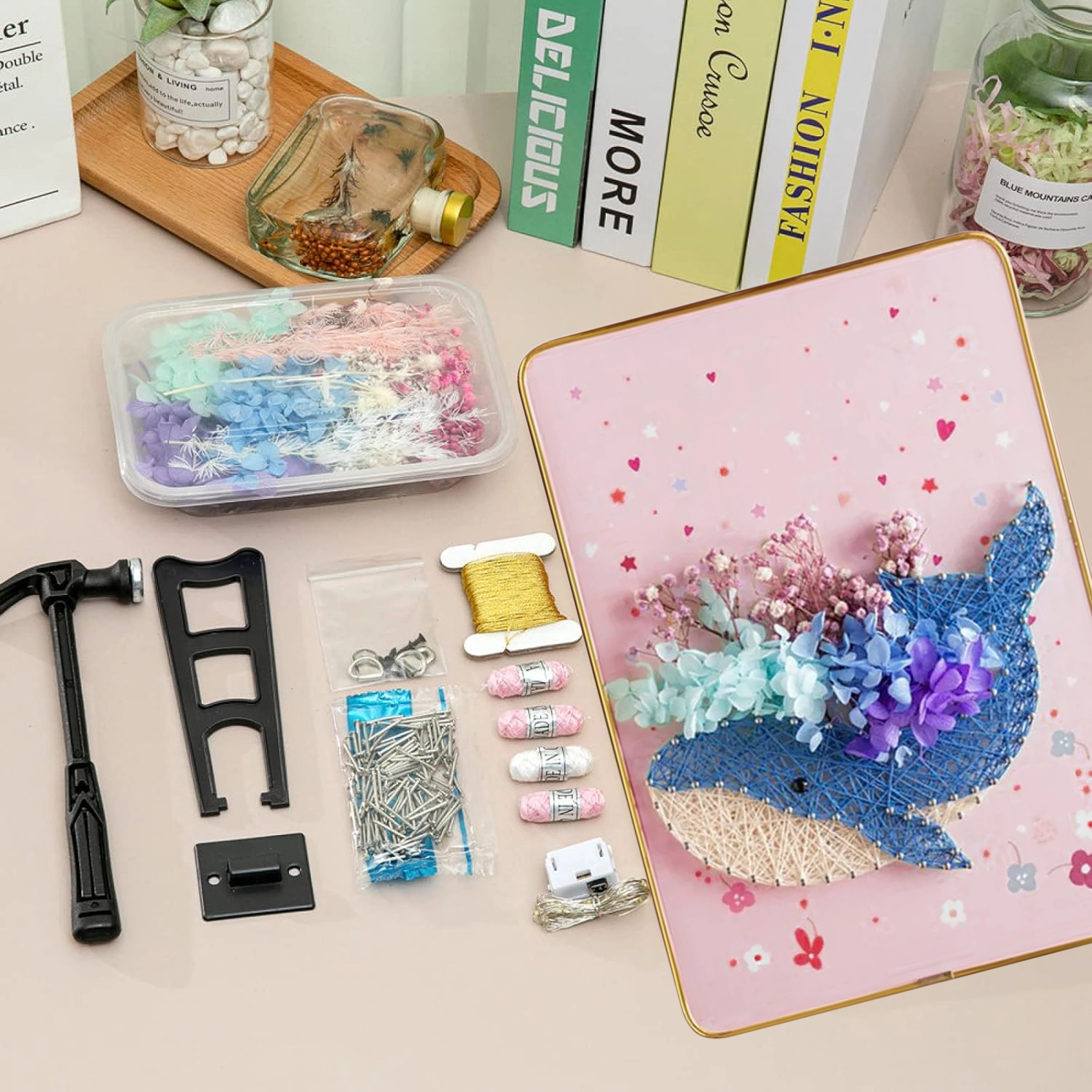 Kompletní DIY set obsahuje podložku v rámu, hřebíčky, nitě a drobné nářadí. Začněte tvořit hned po rozbalení – bez shánění dalších pomůcek.