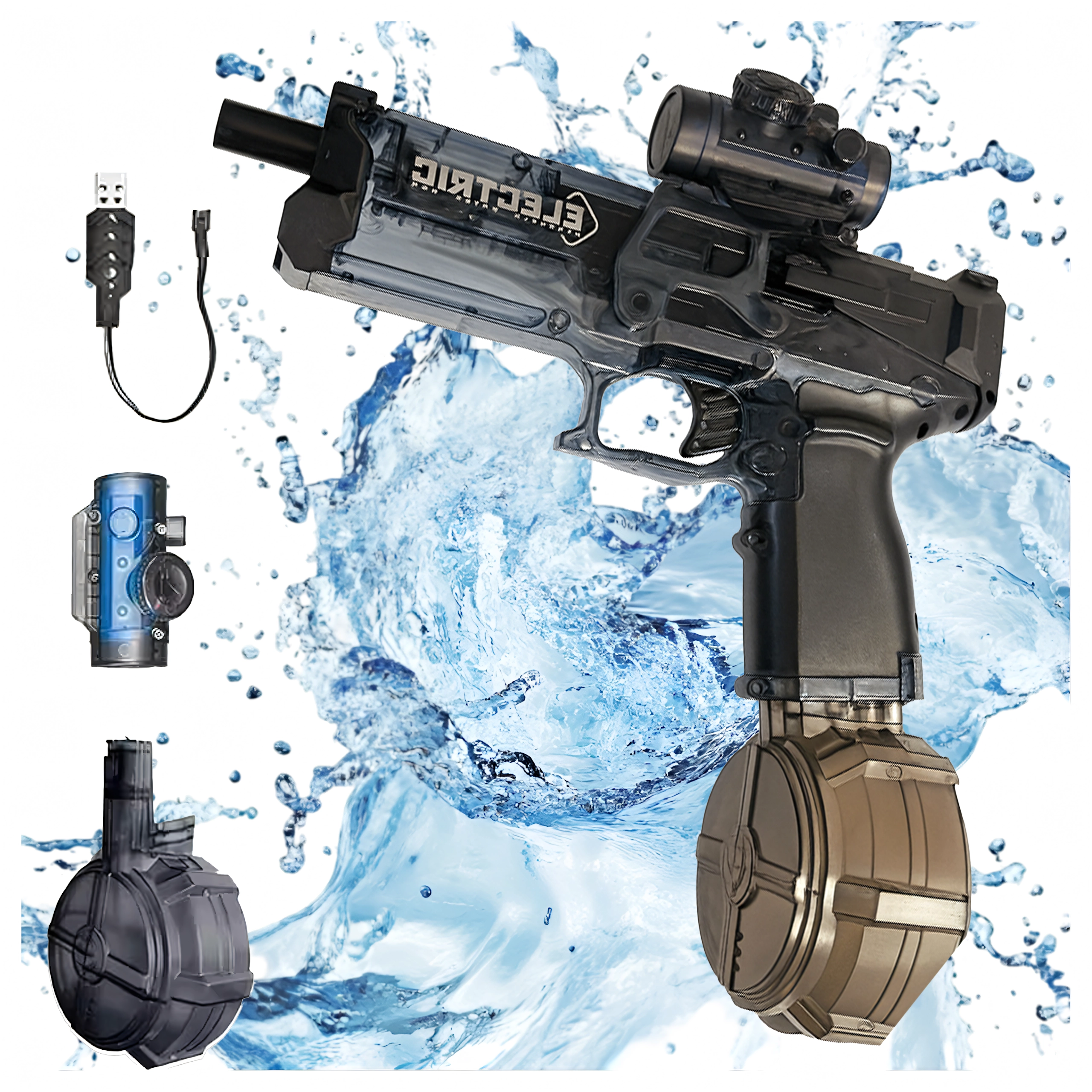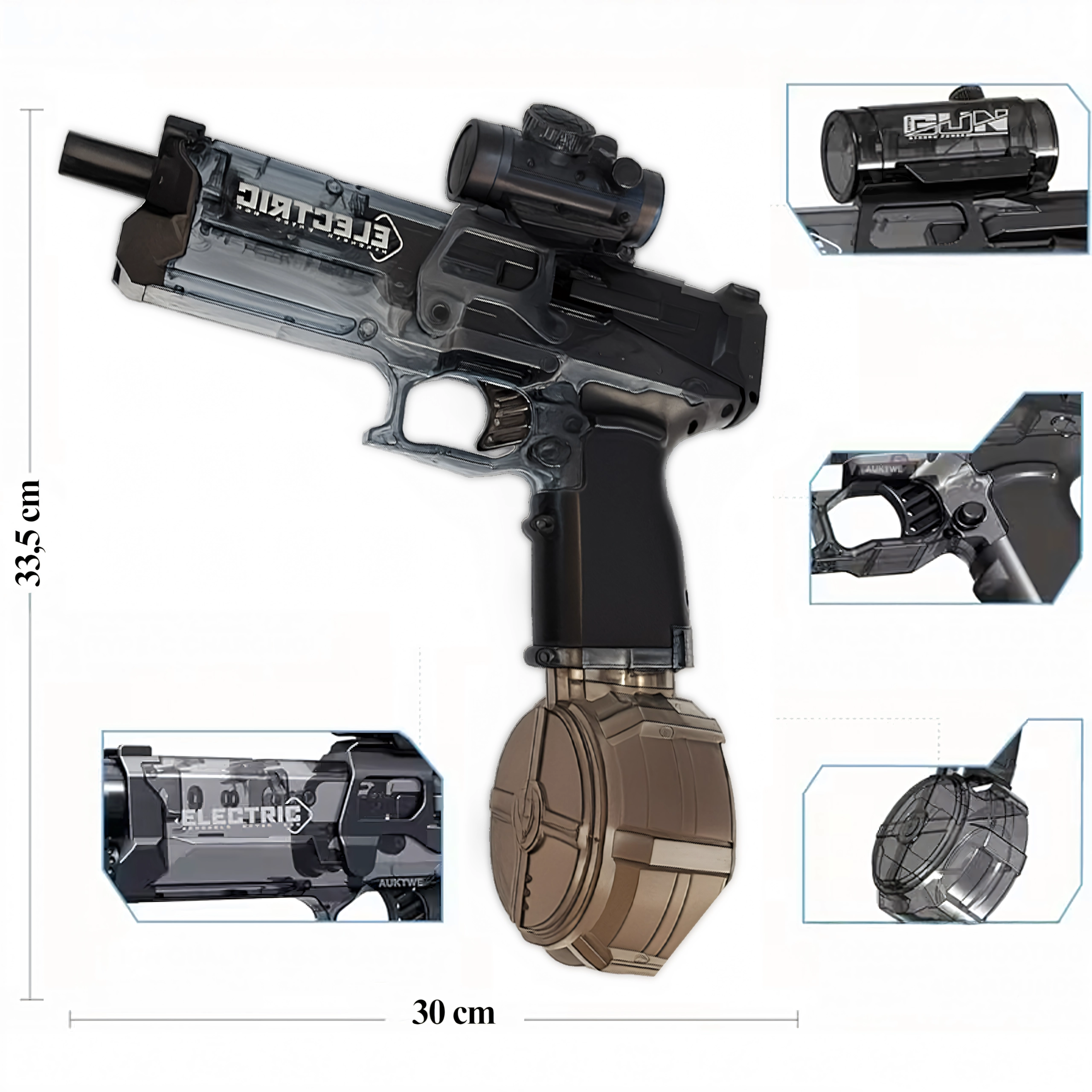 Tato výkonná elektrická vodní pistole přináší dynamickou a pohodlnou hru pro děti i dospělé. Díky automatickému spouštění střílí souvislý proud vody bez nutnosti pumpování, zatímco kapacitní zásobník zajišťuje méně časté doplňování. Vestavěná nabíjecí baterie přes USB poskytne až 35 minut zábavy na jedno nabití.