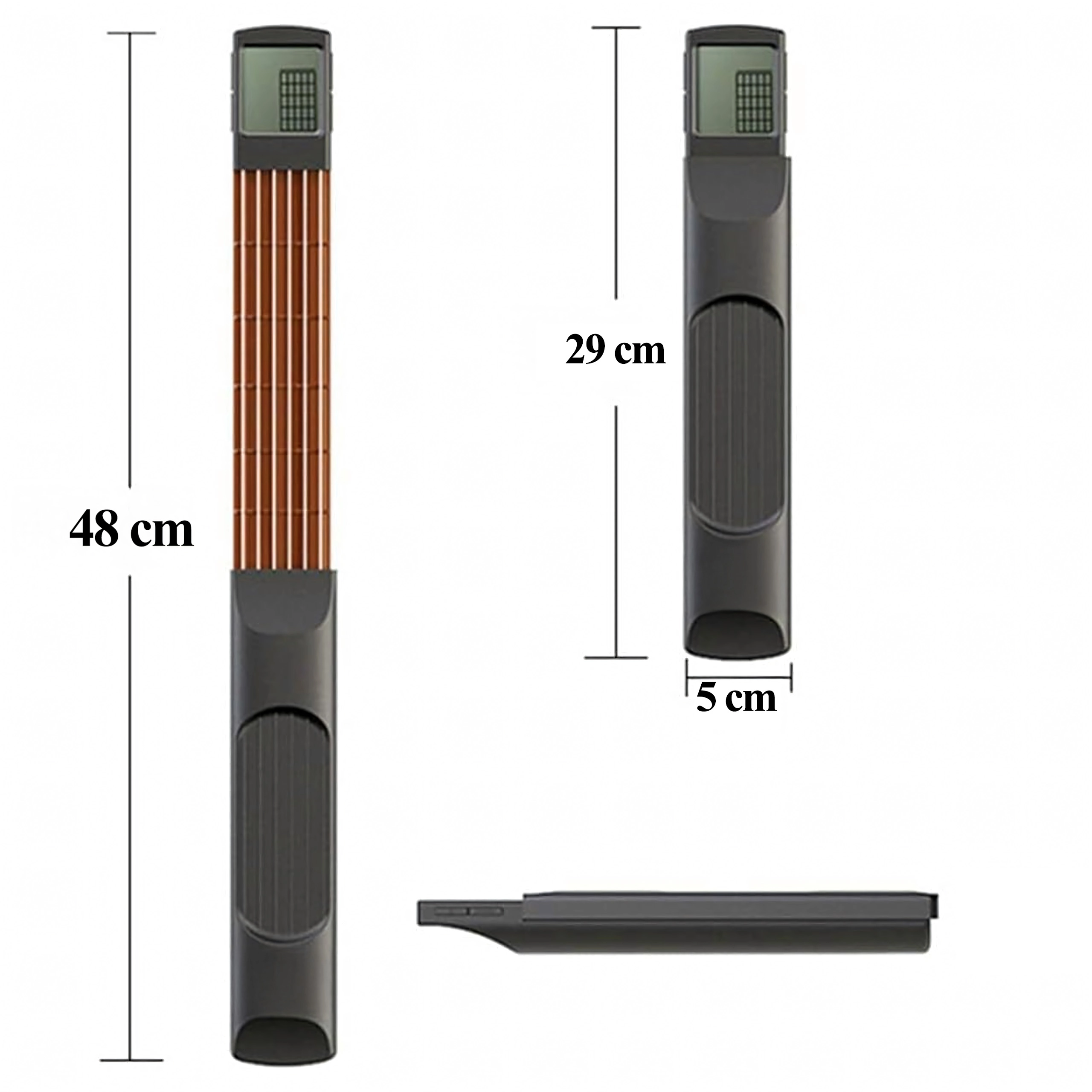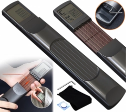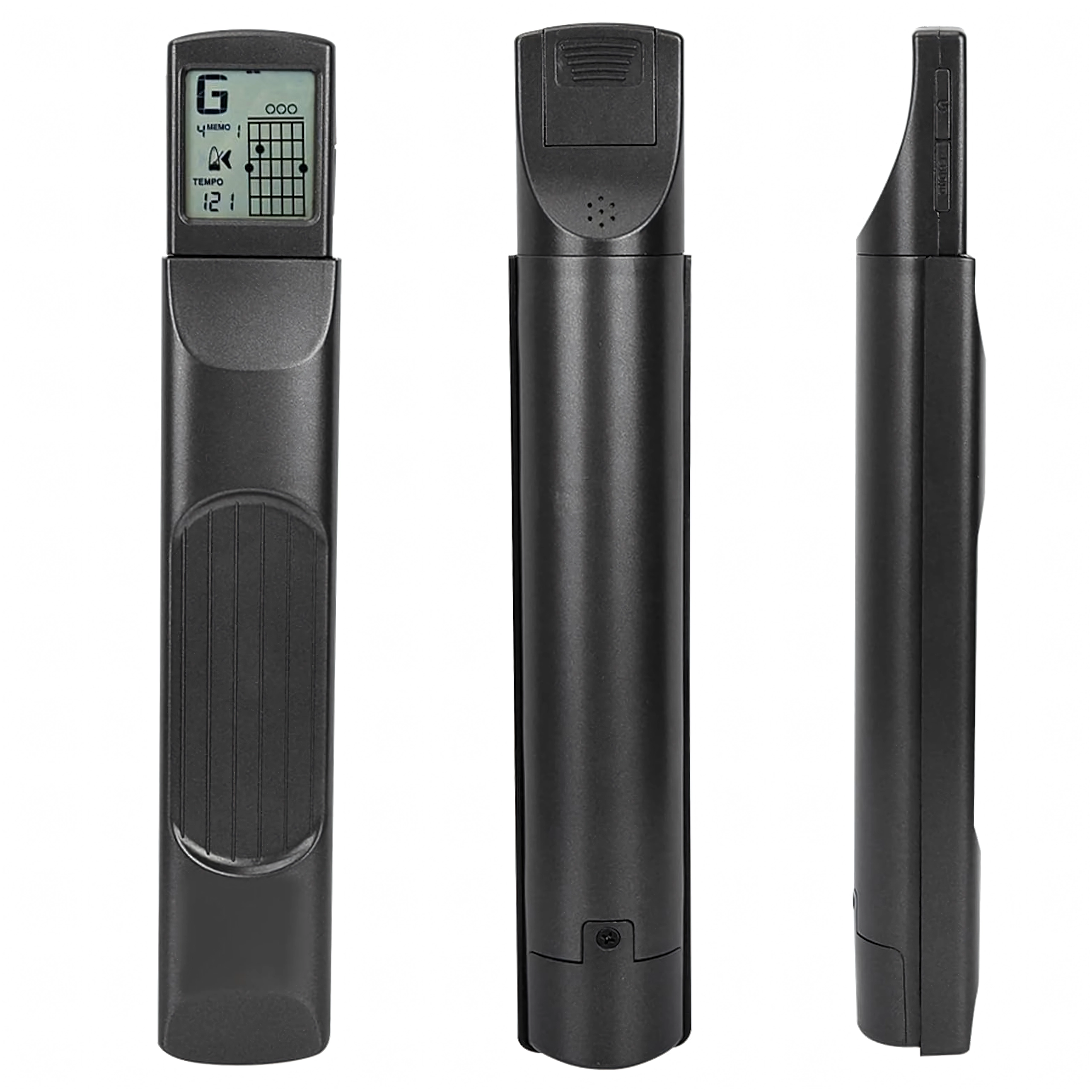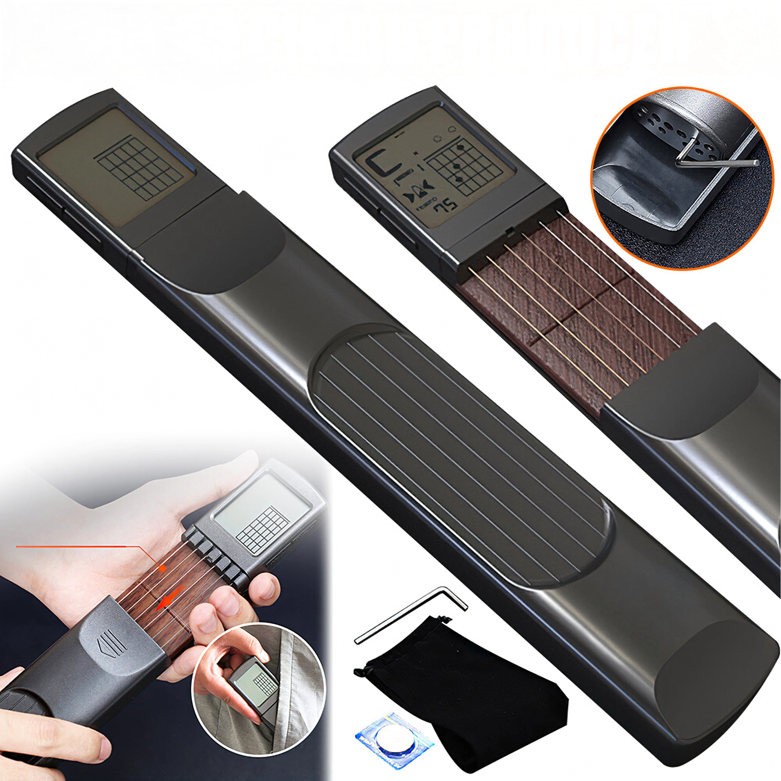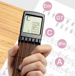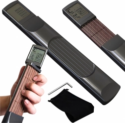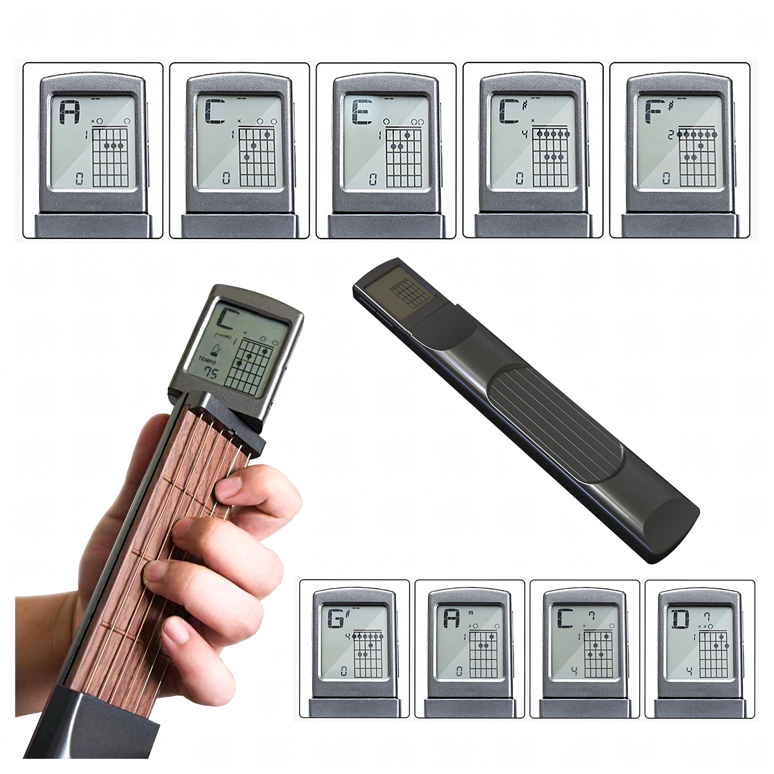 Trénujte akordy, prstoklad a přechody mezi akordy bez rušení okolí. Přenosný cvičný hmatník s krátkou menzurou simuluje reálný pocit ze hry díky ocelovým strunám, zatímco LCD displej zobrazuje diagramy akordů, tempo metronomu a užitečné indikace pro rychlé učení.