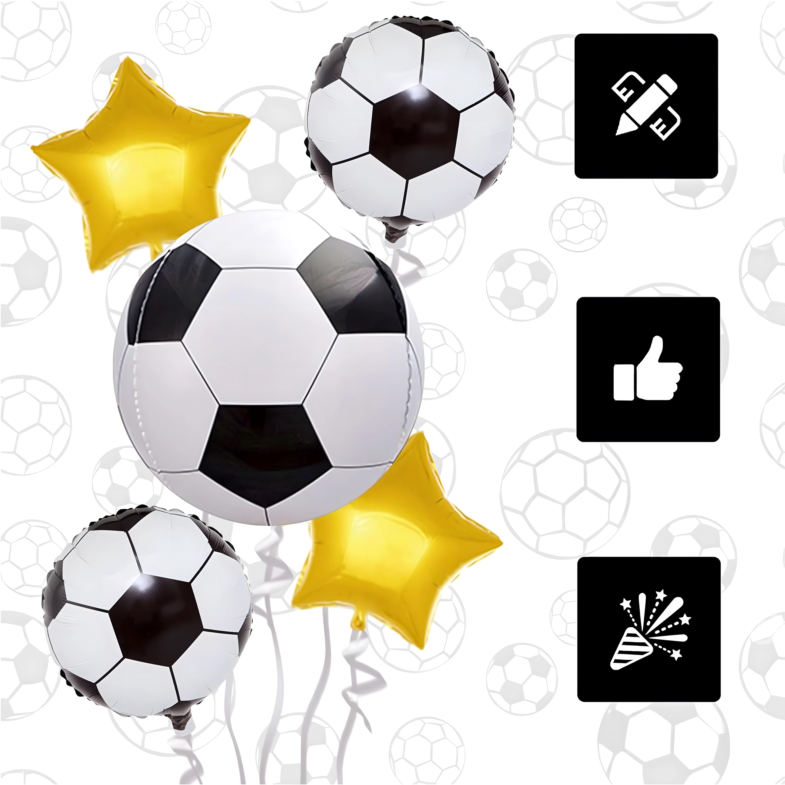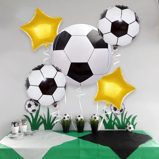 Stylová dekorace na oslavu pro malé i velké fanoušky fotbalu. Tato sada obsahuje 5 balónků: 1 velký fóliový míč cca 56 cm, 2 fóliové balónky ve tvaru fotbalového míče cca 46 cm a 2 zlaté hvězdy cca 46 cm. Ideální pro narozeninovou výzdobu, fotbalové párty i tematické akce.