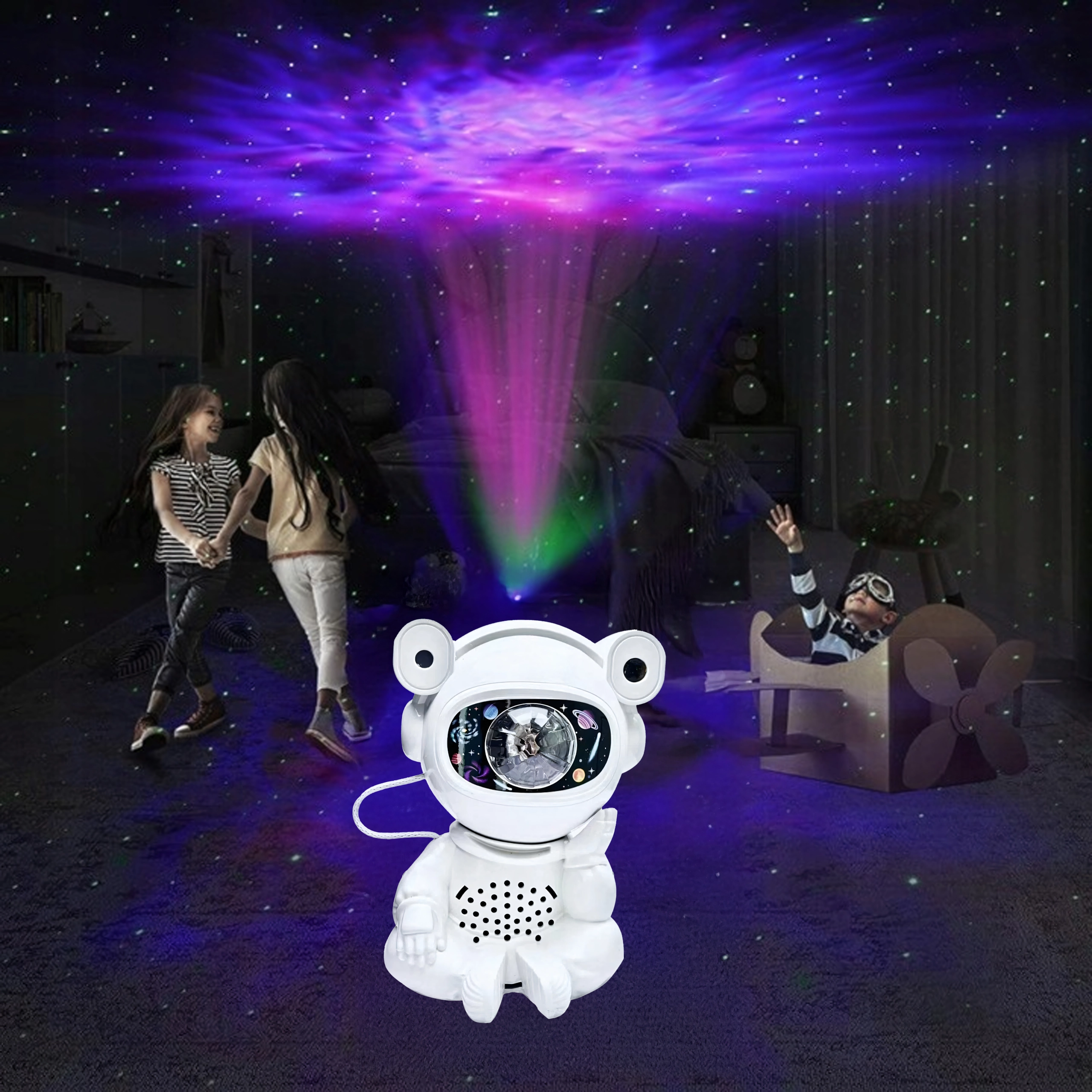Objevte klidné usínání a uklidňující projekci hvězd s lampou ve tvaru astronauta s pohyblivou hlavou. Projekce vytváří na stropě a stěnách působivou galaxii hvězd a mlhovin, která podpoří fantazii dětí a navodí příjemnou atmosféru pro odpočinek.