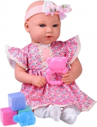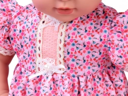 Roztomilá interaktivní panenka miminko o velikosti 46 cm okouzlí svou realistickou tvářičkou, dlouhými řasami a měkkým bříškem. Má kloubové končetiny pro snadné polohování, je oblečená do jemných liliových šatiček s krajkou a nechybí zvukový modul pro ještě autentičtější hraní. V balení najdete i pastelové doplňky pro pestrou hru na pečování.