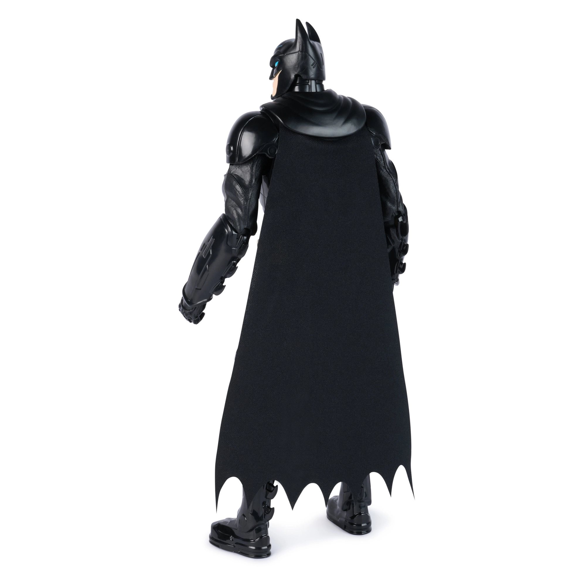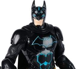 Černé brnění s modrými akcenty, žlutý opasek a emblém netopýra podtrhují ikonický styl postavy z DC COMICS.