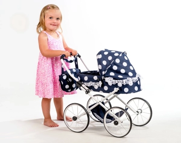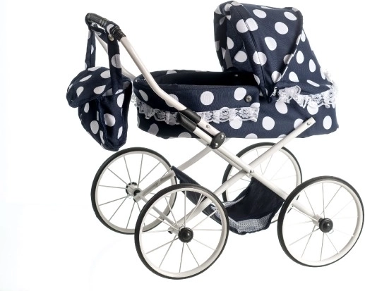 Stylový kočárek pro panenky v retro designu potěší každou malou maminku. Nabízí černé provedení s puntíky a elegantní krajkou, nastavitelnou rukojeť 55 cm pro pohodlné vedení a sklopnou stříšku pro snadnou manipulaci. Součástí je taška přes rukojeť a praktický spodní košík na drobnosti.