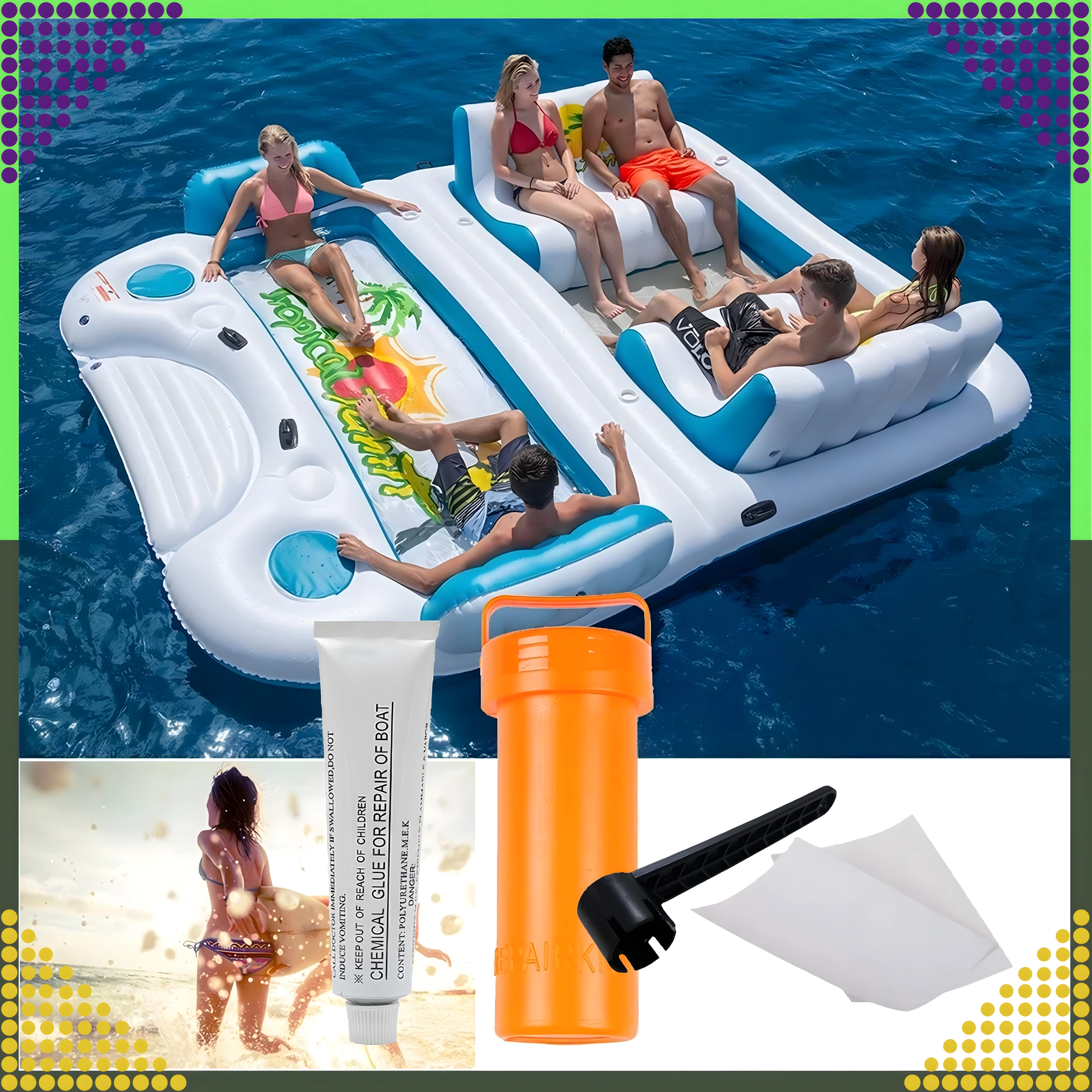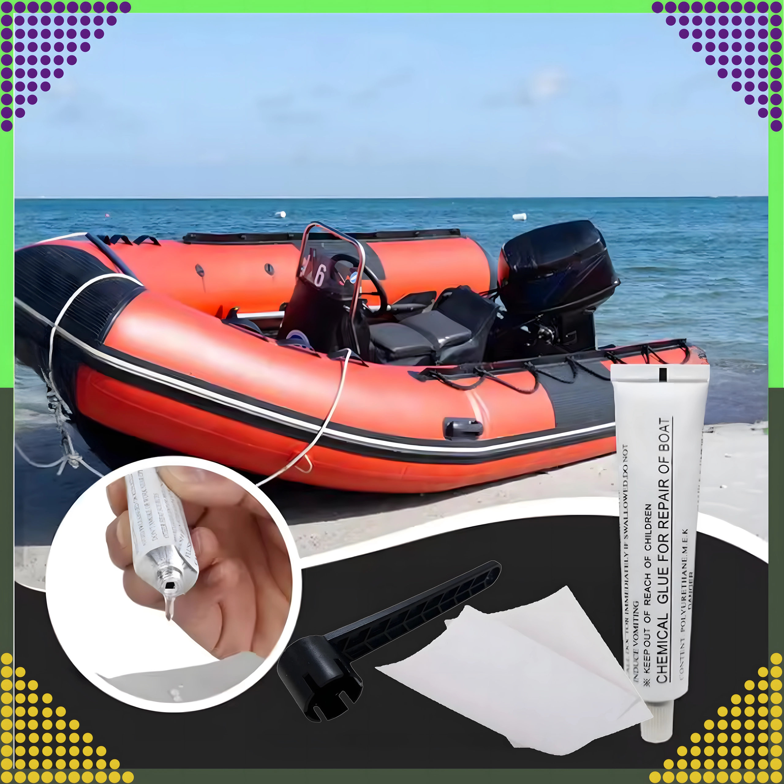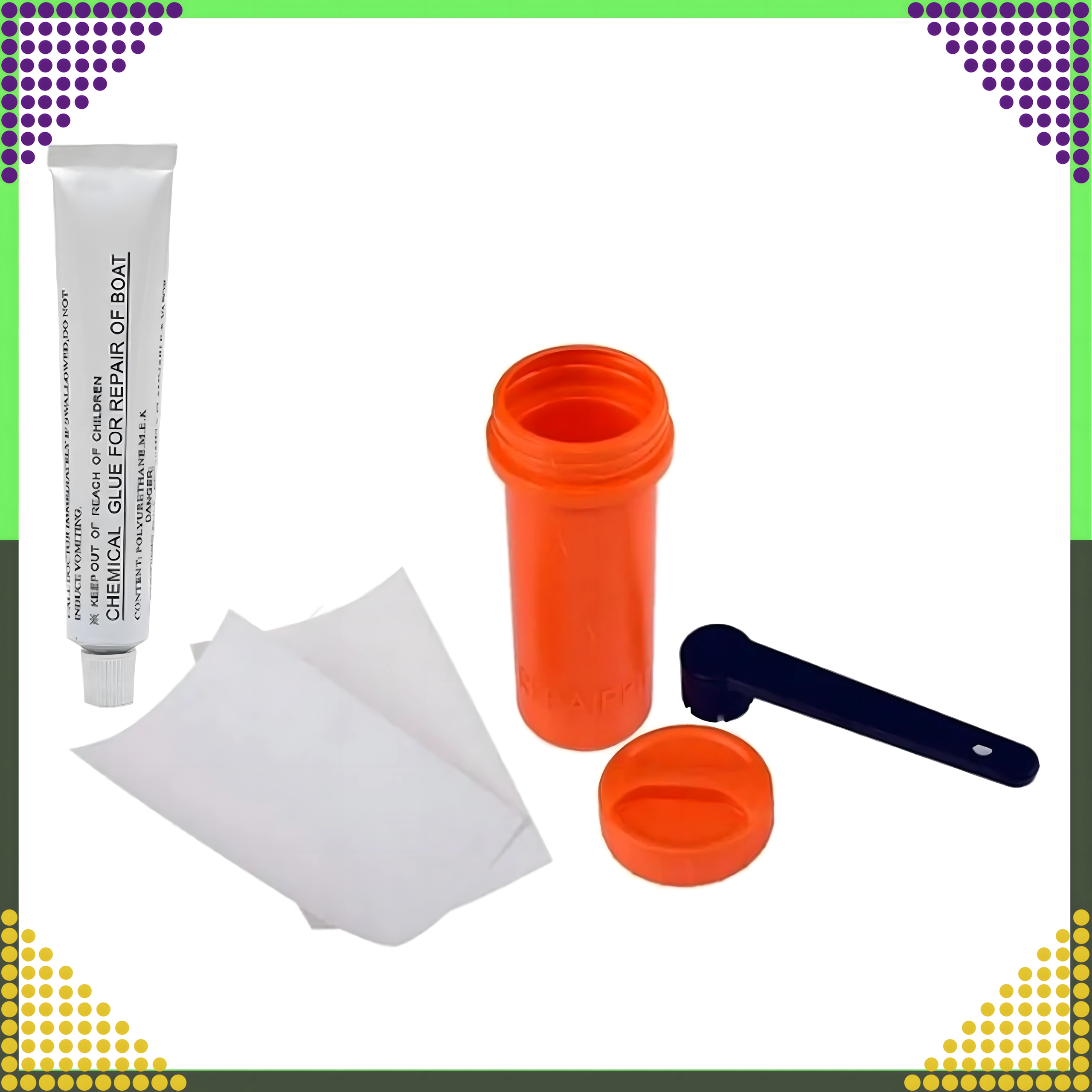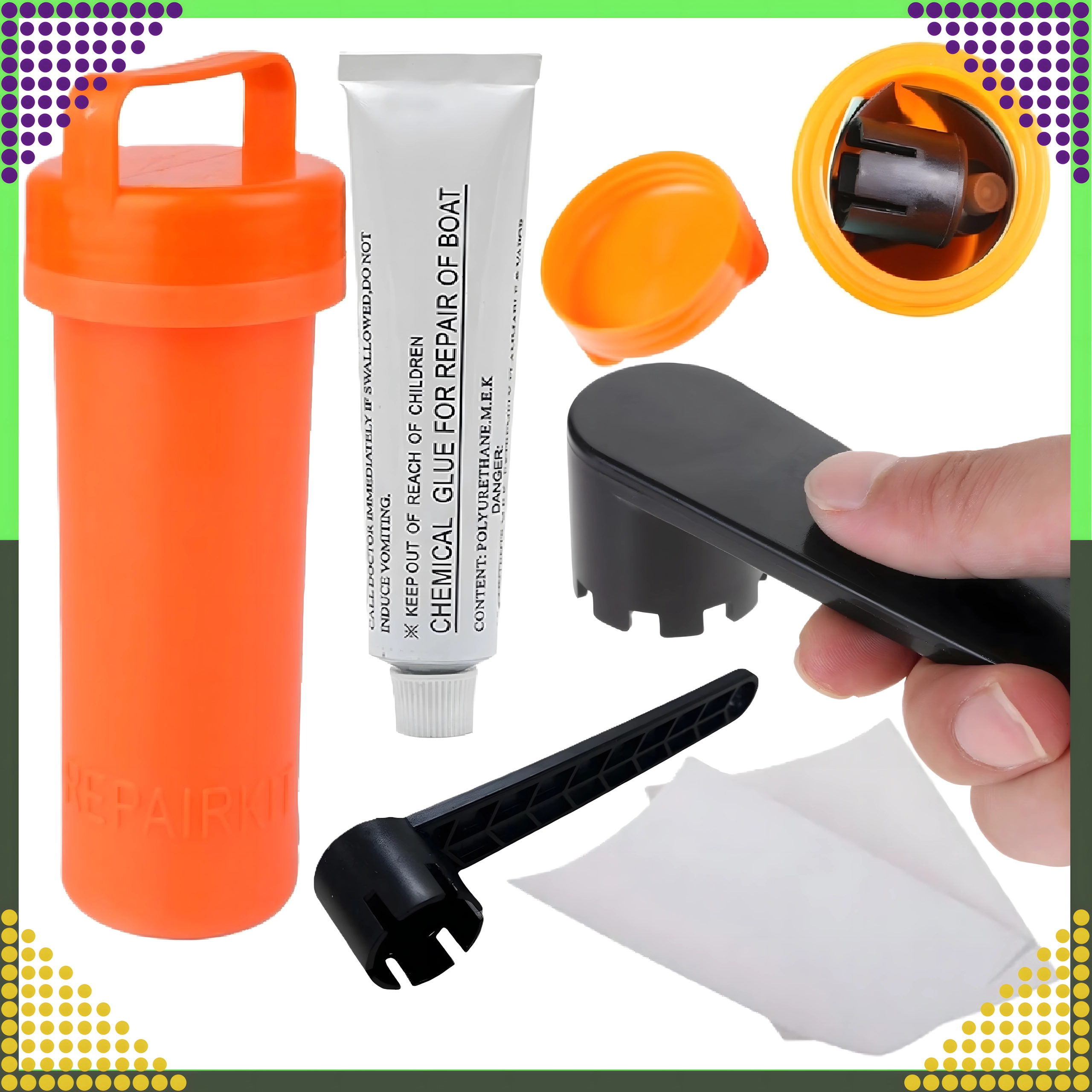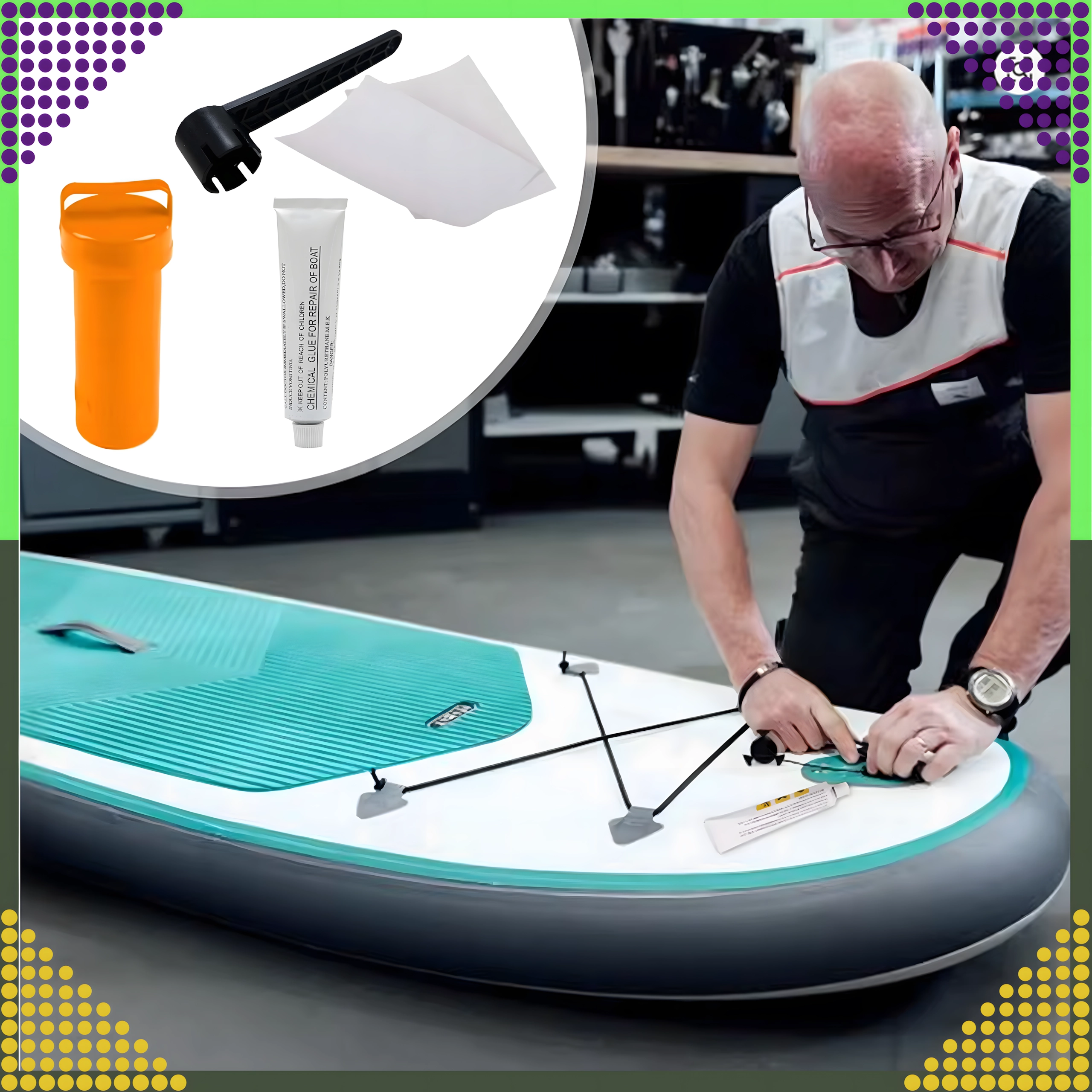 Součástí je chemické lepidlo a záplatové pláty pro pevné a trvanlivé spojení na PVC a nafukovacích plochách. Ideální pro paddleboardy, rafty, matrace i další nafukovací vybavení.