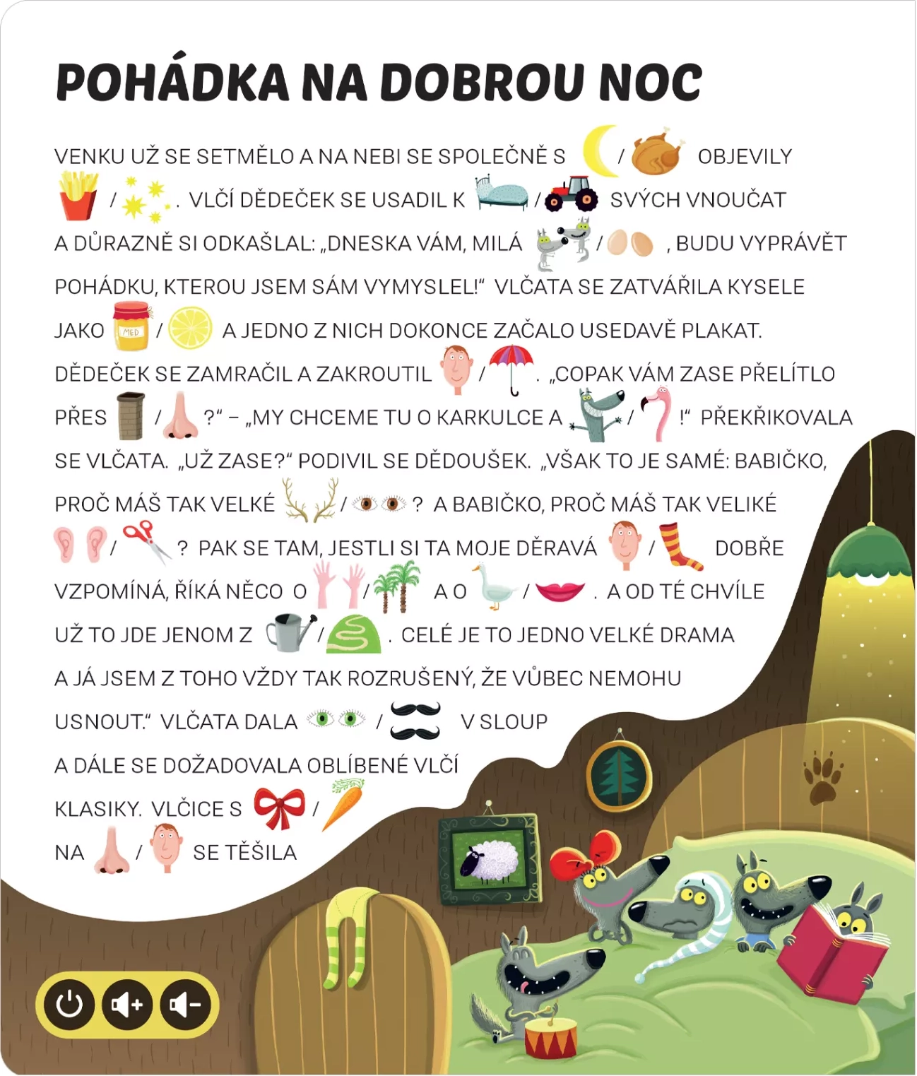 Probuďte doma večerní pohádkovou atmosféru. V knize Obrázkové čtení: Pohádky vlčího dědečka čeká na děti 8 příběhů o strašidlech, které mohou prožívat dvěma způsoby – klasicky, nebo legračně. Obrázky přímo v textu pomáhají s orientací a motivují k samostatnému čtení. Namluvili ji oblíbení interpreti Michal Holán a Klára Oltová.