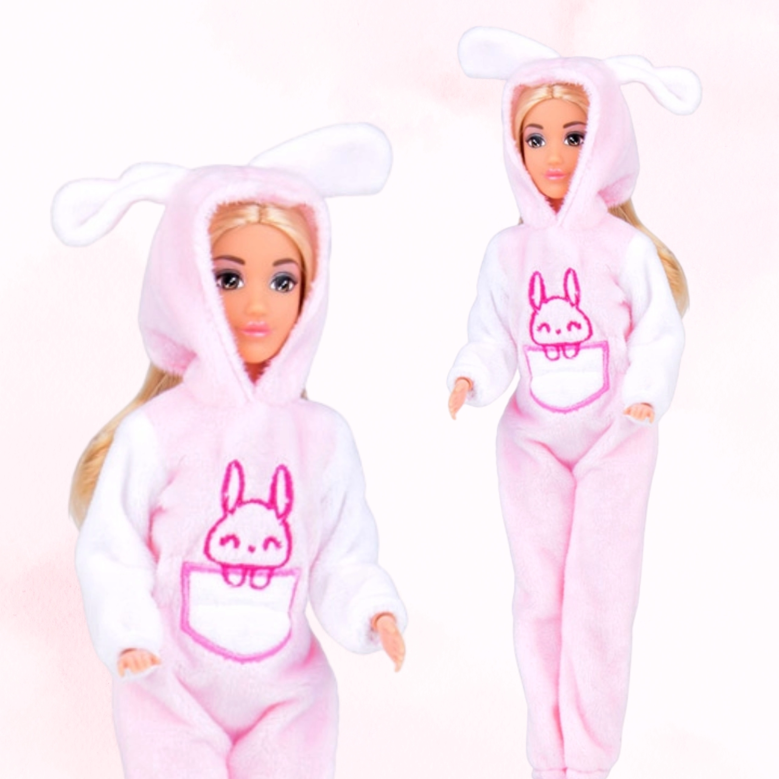 Objevte kouzelný set inspirovaný trendem zvířecích overalů. Panenky v ladících růžových králičích oblečcích mají na hrudi roztomilý motiv králíčka, jsou příjemné na dotek a vyzývají ke kreativitě a vyprávění příběhů. Díky pohyblivým končetinám se snadno převlékají a zaujmou mnoho poloh.