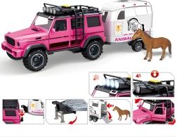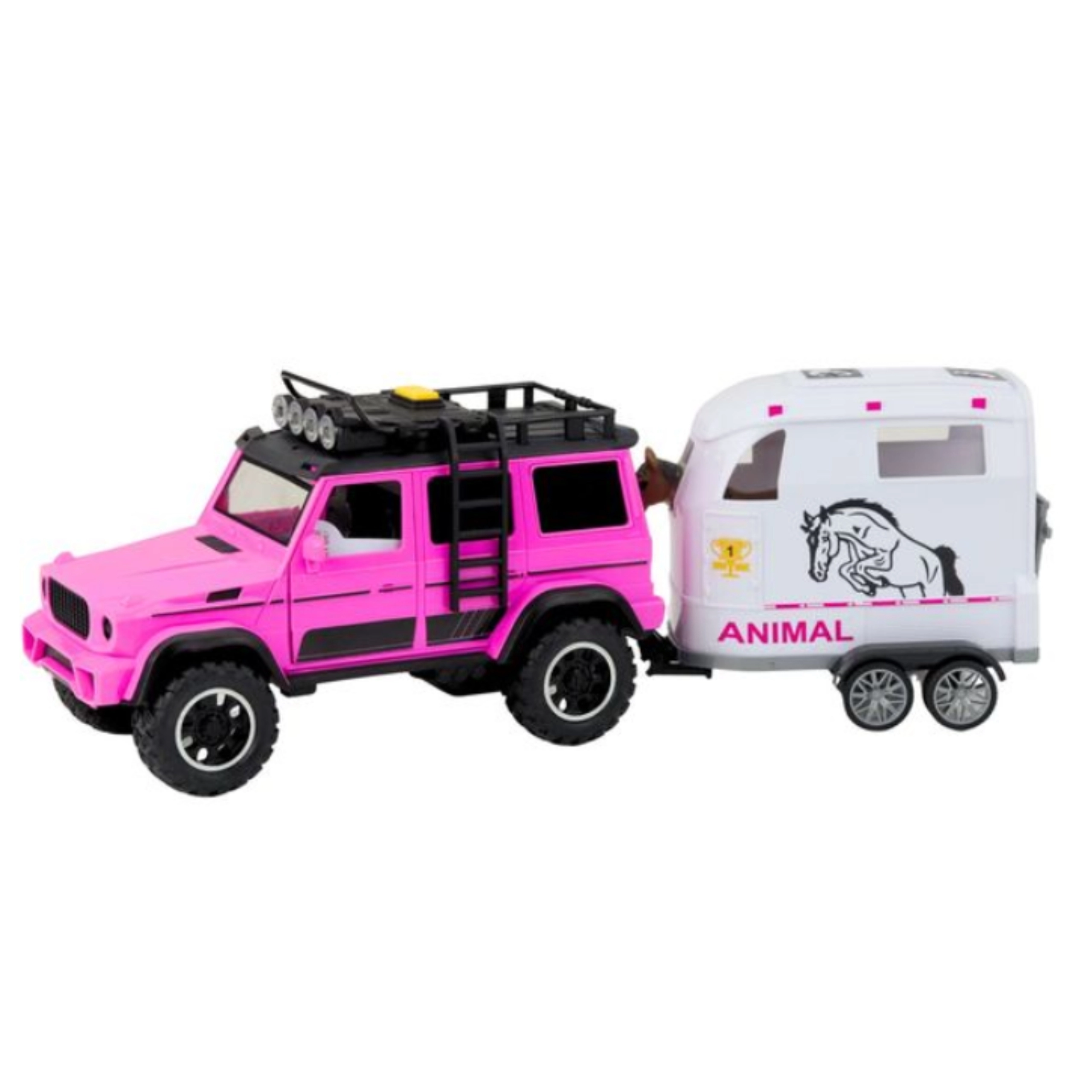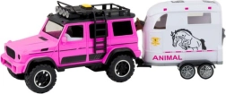 Tento detailně zpracovaný set je ideální pro malé milovníky zvířat a terénních vozidel. Růžovo-bílá kombinace barev zaujme na první pohled a interaktivní prvky jako světla, zvuky a otevírací dveře přinášejí autentický zážitek ze hry. Díky odnímatelnému přívěsu si děti mohou hrát s autem, přívěsem i koníkem samostatně a rozvíjet tak fantazii.