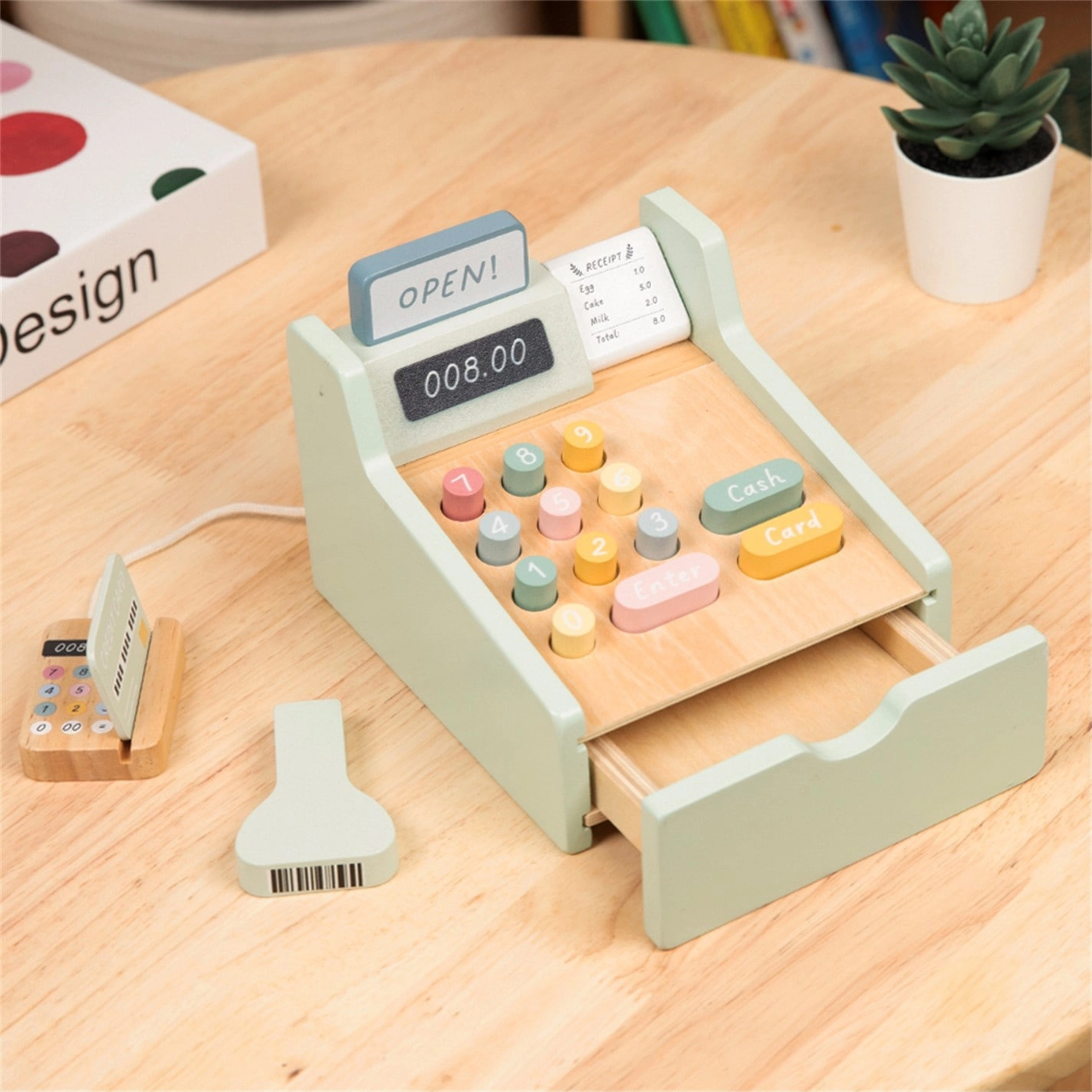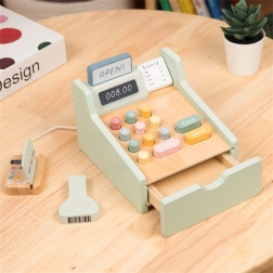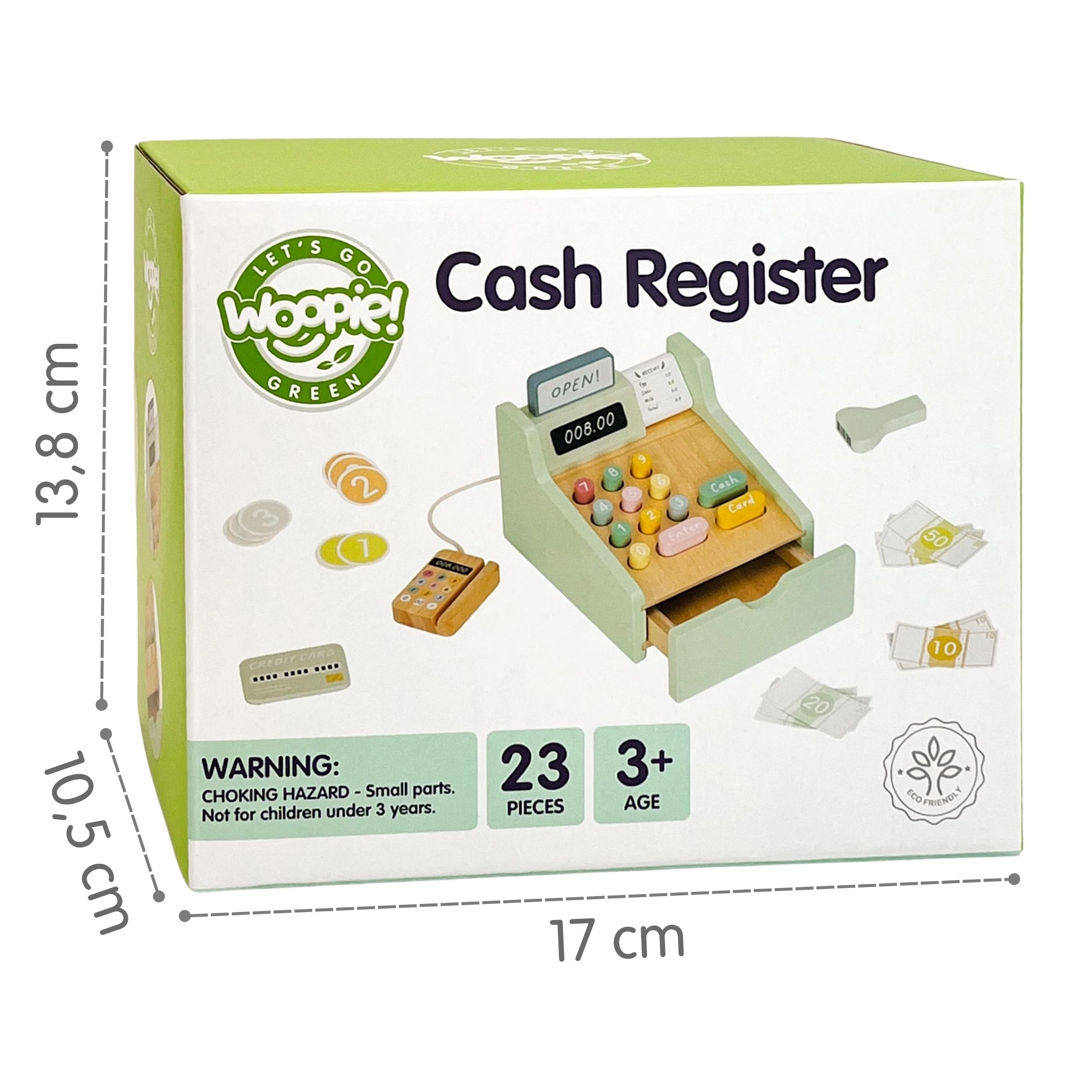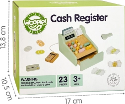 Dřevěná pokladna WOOPIE GREEN je ideální hračka pro děti od 3 let, které milují hru na obchod, kavárnu nebo restauraci. Díky funkčním prvkům, jako je vysouvací šuplík na peníze, skener čárových kódů a čtečka platebních karet, se děti naučí základy placení a hospodaření s penězi přirozenou a zábavnou formou.