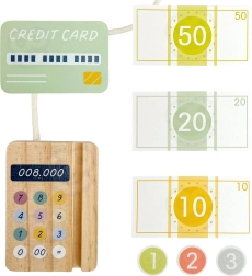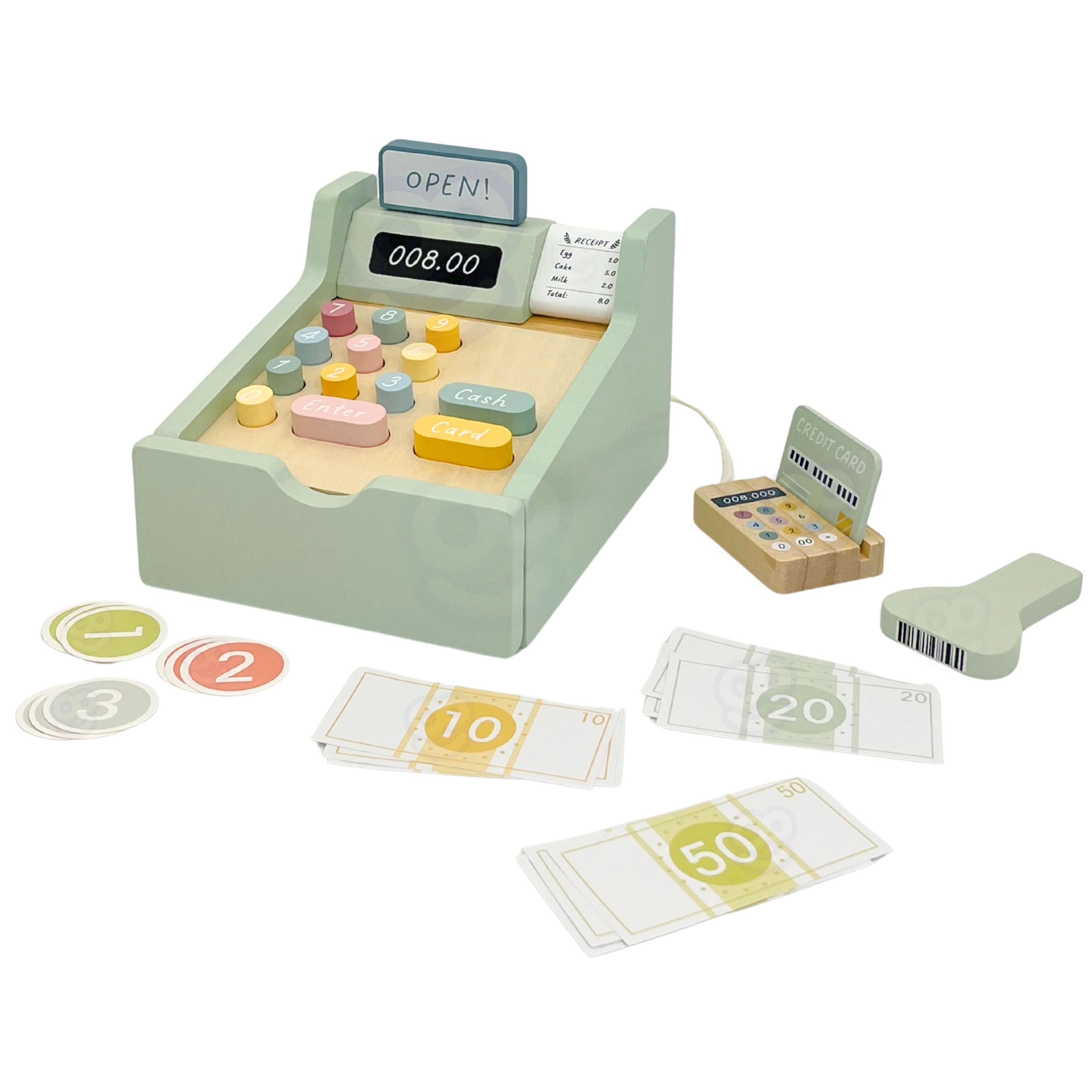 Set obsahuje vše, co malý prodavač potřebuje: dřevěnou pokladnu s barevnými tlačítky, skener, čtečku karet, platební kartu, mince a bankovky. Hra rozvíjí logické myšlení, matematické dovednosti, koordinační schopnosti i komunikaci při rolové hře mezi prodavačem a zákazníkem.