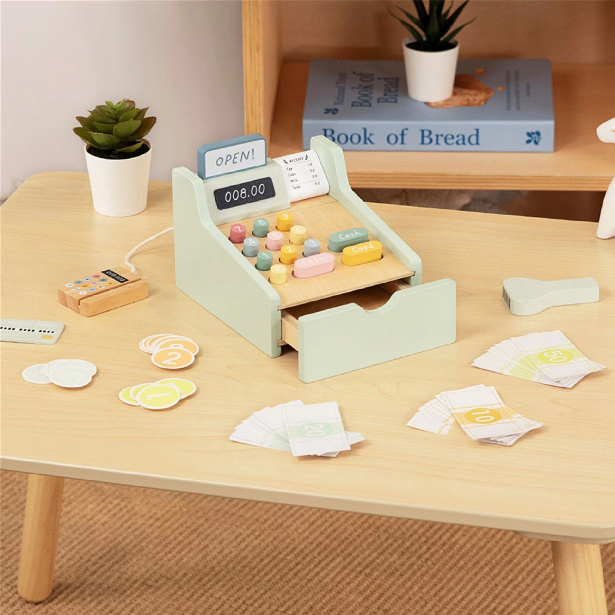 Děti si zamilují otevírání pokladní zásuvky, třídění mincí a mačkání přehledných tlačítek – skvělý trénink jemné motoriky a koordinace.