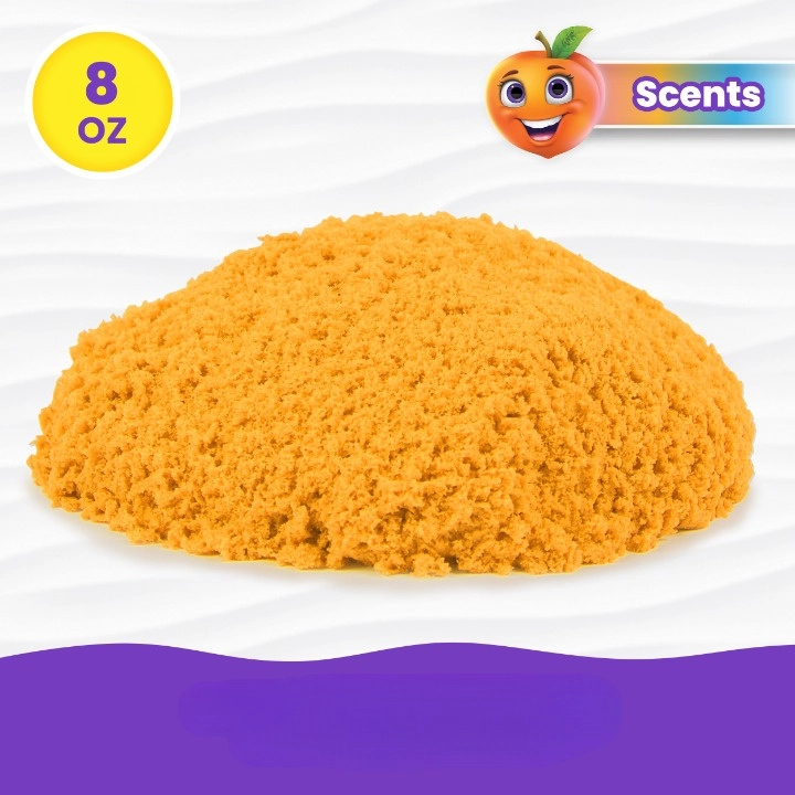 KINETIC SAND Scents přináší smyslové hraní s realistickým pocitem mokrého písku, který se přitom nelepí na ruce. Příjemná vůně broskve podněcuje fantazii, zatímco měkká a tvarovatelná textura podporuje rozvoj jemné motoriky a soustředění.