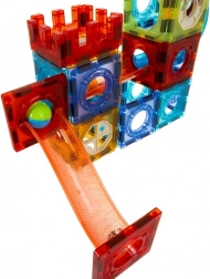 Průhledné panely se pevně spojí díky silným magnetům, takže věže, mosty i rampy drží tvar a hra plyne bez zbytečných pádů.