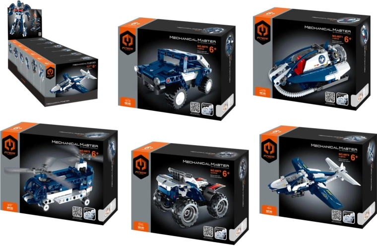 Vybírat můžete z šesti provedení: jeep, čtyřkolka, vrtulník, letadlo, hovercraft a další speciální vozidla. Každý model je navržen pro snadné sestavení podle návodu a stabilní hraní. Po získání všech šesti krabiček lze z kombinovaných dílků postavit impozantního robota – mechanického strážce, který se stane dominantou celé kolekce.