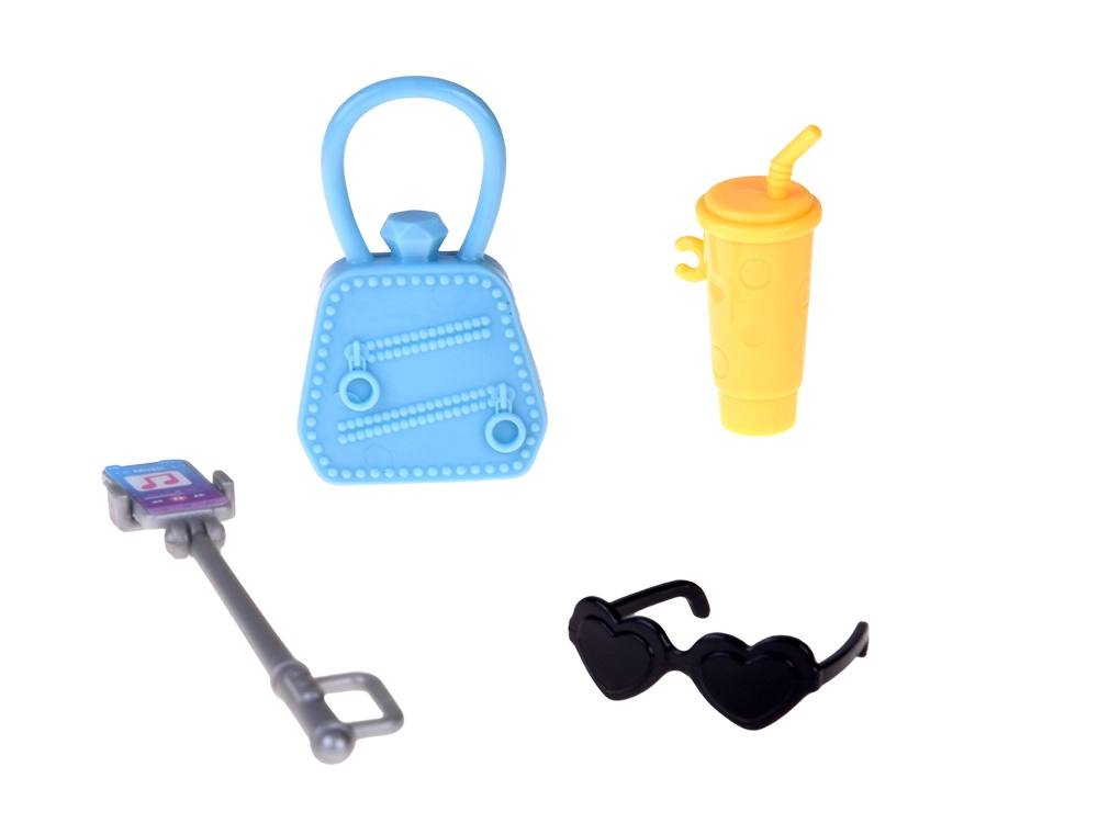 Kabelka, brýle ve tvaru srdíček, kelímek s nápojem a selfie tyč se smartphonem (atrapy) rozšiřují možnosti hry.