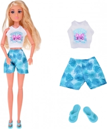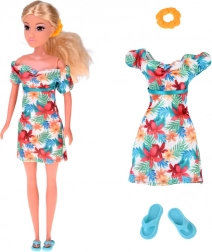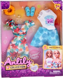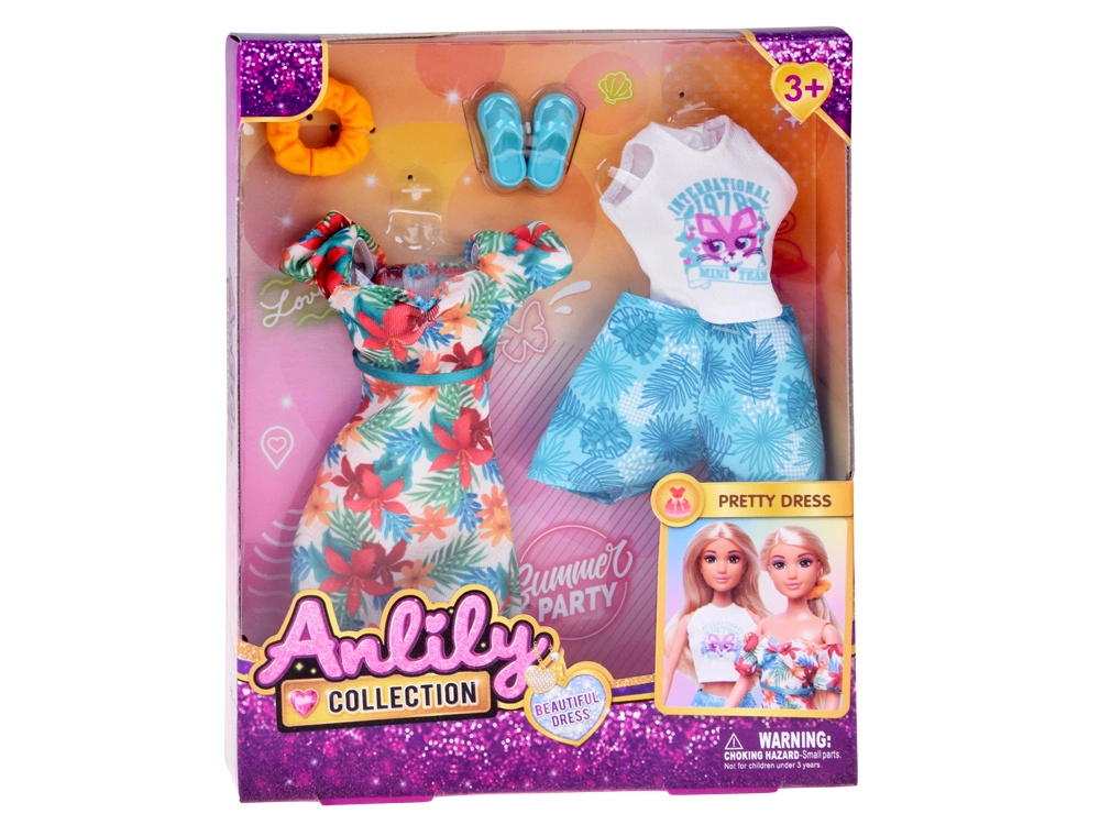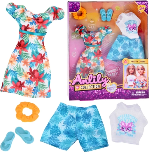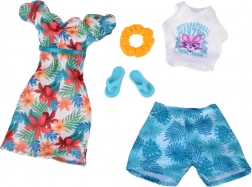 Set nabízí dvě letní stylizace: lehoučké šaty s havajskými květy ideální na plážové procházky a bílé crop tričko se šortkami s motivem listů pro pohodlné dny plné dobrodružství. Perfektní pro kreativní hru, převlékání a vyprávění prázdninových příběhů.