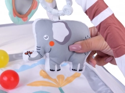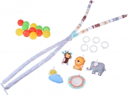 Plyšová zvířátka, sluníčko s mráčkem, dětské zrcátko a barevné míčky podporují zrak, hmat i sluch a motivují k natahování, uchopování a otáčení.