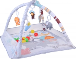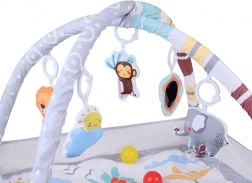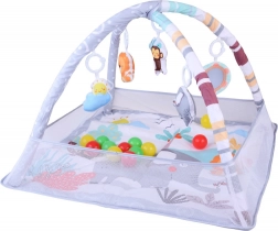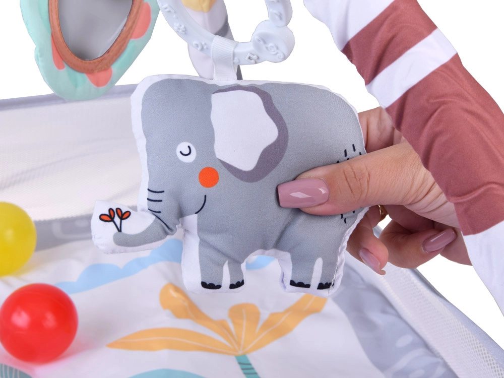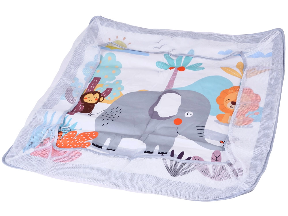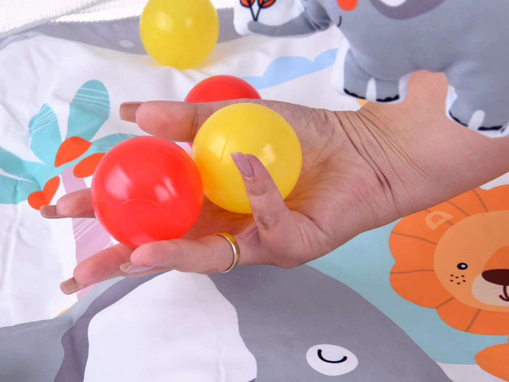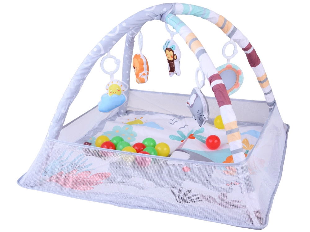 Tato edukační podložka s měkkým polstrováním a veselými zvířátky vytváří bezpečný koutek pro objevování světa od prvních dnů. Dva křížené, lehce odnímatelné oblouky nesou závěsné hračky, které lákají ke sledování, uchopování a pohybu. Síťované bočnice pomáhají udržet hračky i míčky uvnitř a zvyšují pocit bezpečí.