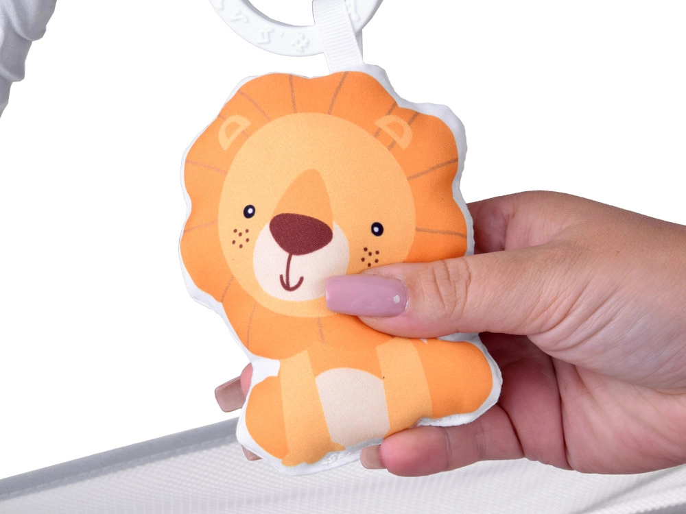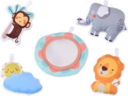 - závěsné hračky včetně zrcátka, sluníčka s mráčkem a zvířátek (lev, slon, opička)