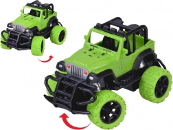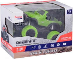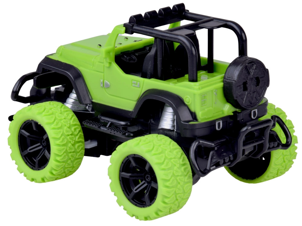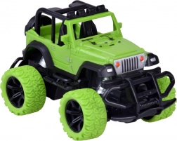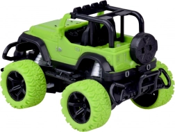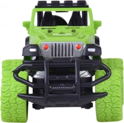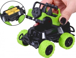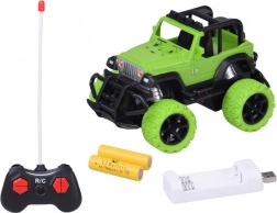 Užijte si akční jízdu doma i venku s odolným RC terénním autem v jasně zelené barvě s černými detaily. Velká terénní kola z gumy zajišťují jistý záběr na různých površích, zatímco regulace sbíhavosti/otáčení předních kol pomáhá doladit přímou jízdu a přesné manévry. Dvě červené LED diody na podvozku dodají jízdě efektní vzhled.