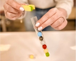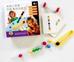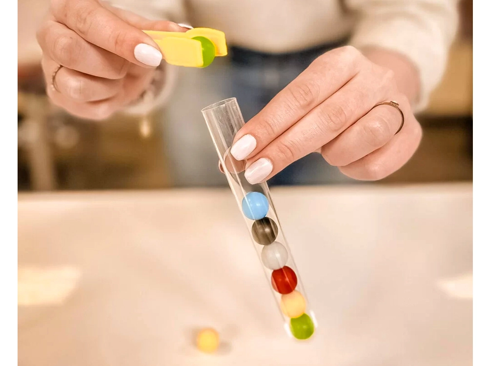 Tato originální vzdělávací hra inspirovaná metodou MONTESSORI podporuje učení skrze činnost. Děti uchopují barevné kuličky pinzetou a vkládají je do zkumavky, a to buď libovolně, nebo podle karet se vzory. Cvičí tak přesnost pohybů, trpělivost a zrakově‑pohybovou koordinaci.
